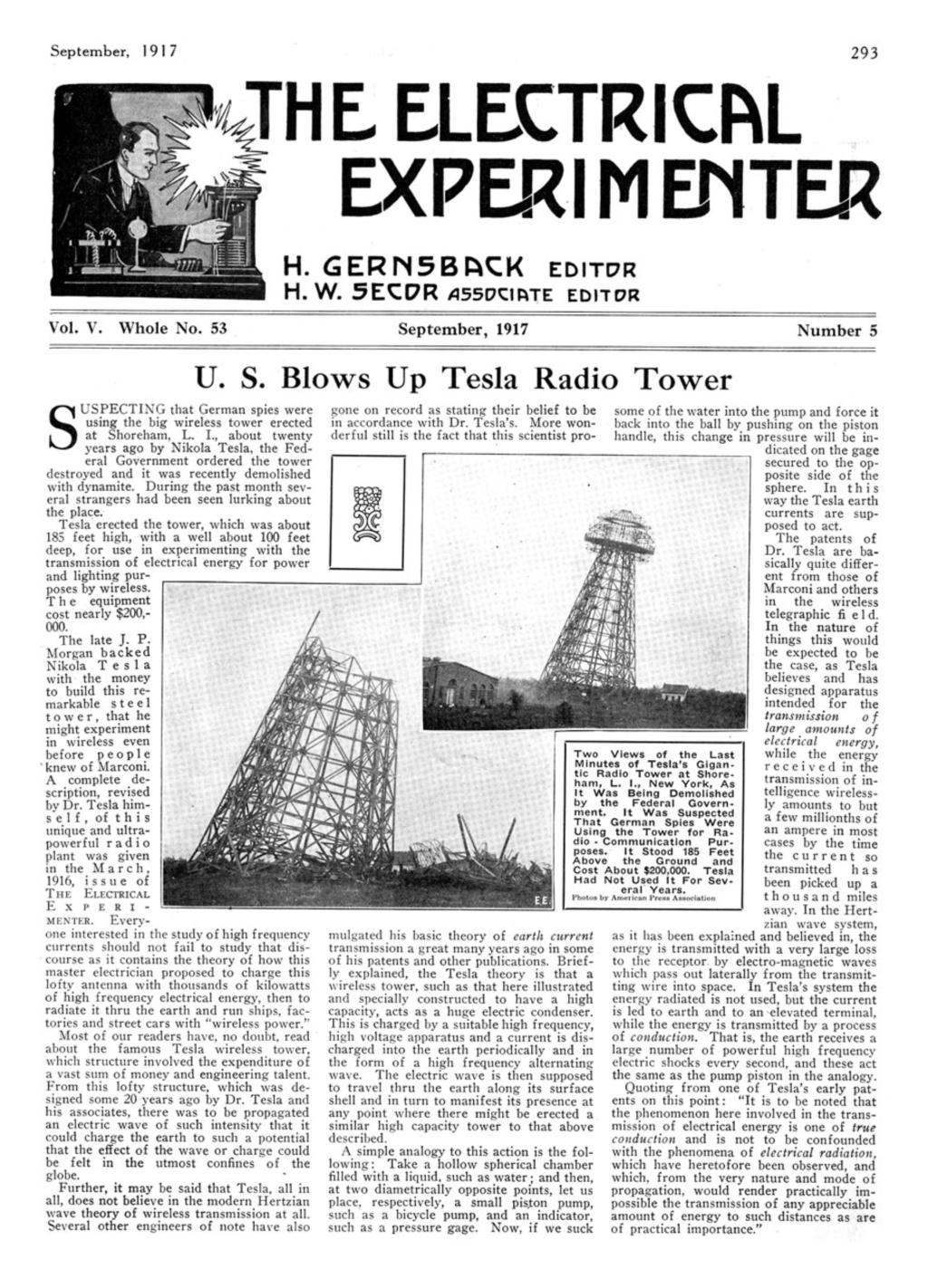 Ultimately, our government may still have destroyed the Wardenclyffe tower after deciding that it wasn’t worth the risk that a foreign country might gain control of it and use it against America or our allies. In doing so, the government would have had to coverup its own actions had Wardenclyffe been operational. Depending on which businesses and foreign embassies that would have been under contract with Wardenclyffe, it may have been easier to explain an enemy sabotage or an electrical malfunction that caused its destruction in order to explain why it was shutdown.