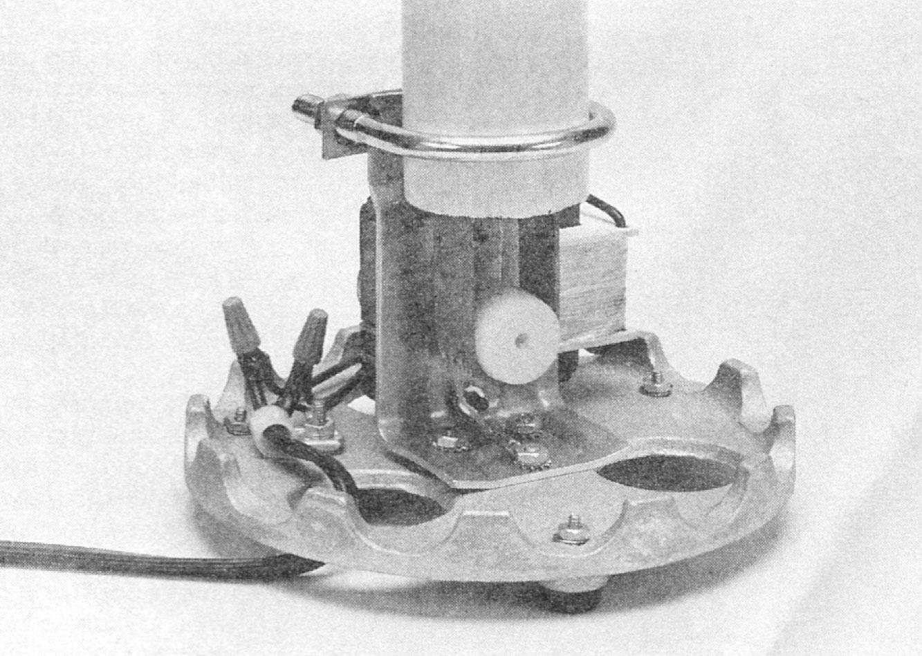Once you've obtained the kit, begin by attaching the three rubber feet to the round metal base. Now locate the L-shaped motor bracket and the lower brush, which is the short length of stranded wire that's connected to a soldering lug. Push three small screws (8-32 x 1/2-inch) up through the bottom of the base and the motor bracket. Place lock washers on the screws and secure the assembly with three 8-32 hex nuts. The lower brush goes on the screw furthest away from the 90-degree bend in the motor bracket. The brush should point towards the vertical section of the bracket. Handle the brush carefully as it is delicate.