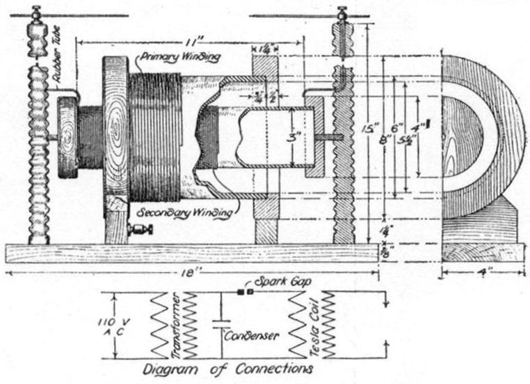 The coil here described is suitable for use with spark coils giving from a two to six inch spark or with a ¼ k. w. transformer. It is not advisable to make a larger coil unless oil is used for insulating. The coil shown in the photograph will give a seven inch spark when used in connection with a ¼ k. w. closed core transformer (magnetic leakage type), glass plate condenser and a rotary spark gap. When a stationary gap is used the sparking distance is about five inches.