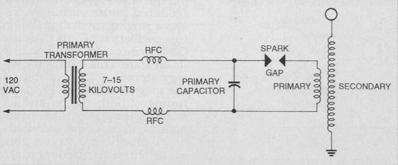 The voltage output of a classical Tesla coil's secondary, a series-resonant circuit, is produced by oscillations in the secondary winding, as shown in Fig. 1. The Q or figure of merit for a resonant circuit and the applied frequency determine the voltage developed across the inductor.