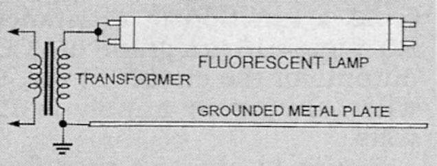 Many interesting experiments can be performed with this circuit. By attaching a small brass drawer knob to the high-voltage lead, sufficient RF energy will be radiated to light low-wattage fluorescent lamps up to several inches away, without wires (see Figs. 4 and 5).