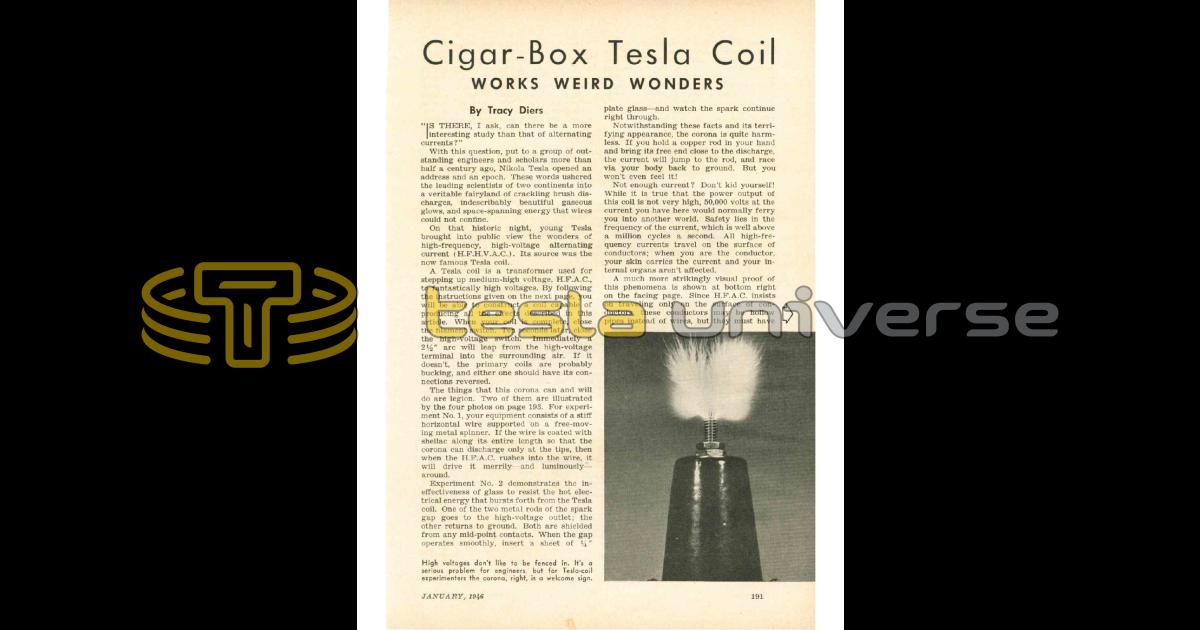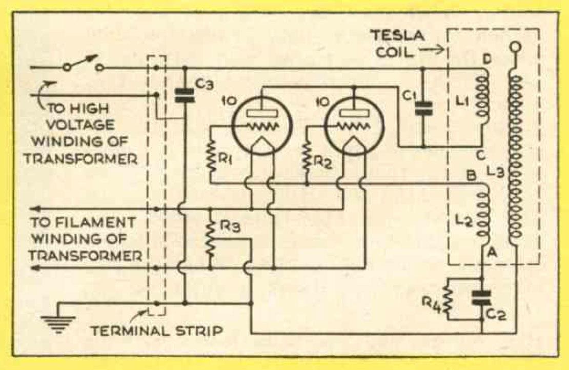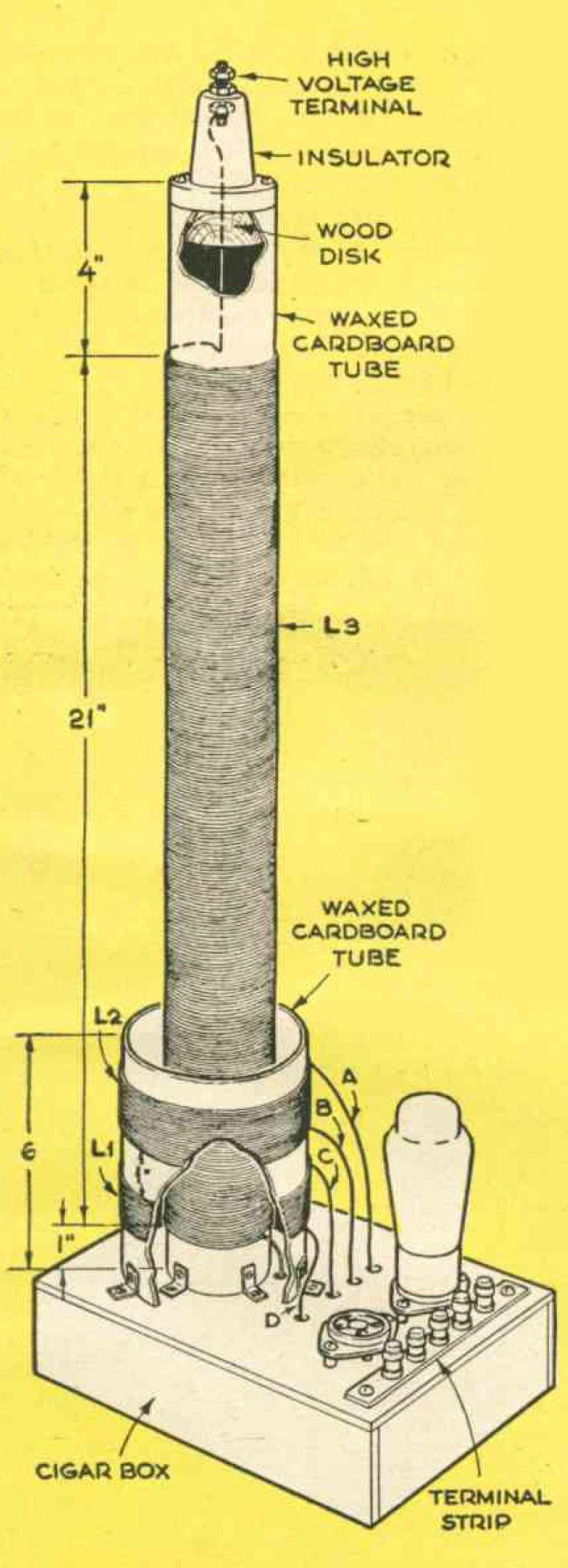 A Tesla coil is a transformer used for stepping up medium-high voltage, H.F.A.C., to fantastically high voltages. By following the instructions given on the next page, you will be able to construct a coil capable of producing all the effects described in this article. When your coil is complete, close the filament switch. Ten seconds later, close the high-voltage switch. Immediately a 2 1/2" arc will leap from the high-voltage terminal into the surrounding air. If it doesn't, the primary coils are probably bucking, and either one should have its connections reversed.