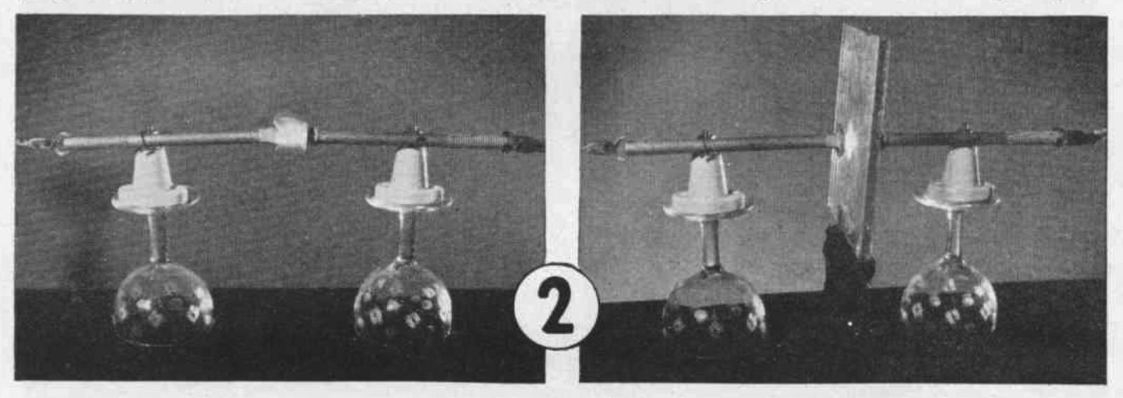 The things that this corona can and will do are legion. Two of them are illustrated by the four photos below. For experiment No. 1, your equipment consists of a stiff horizontal wire supported on a free-moving metal spinner. If the wire is coated with shellac along its entire length so that the corona can discharge only at the tips, then when the H.F.A.C. rushes into the wire, it will drive it merrily - and luminously - around.