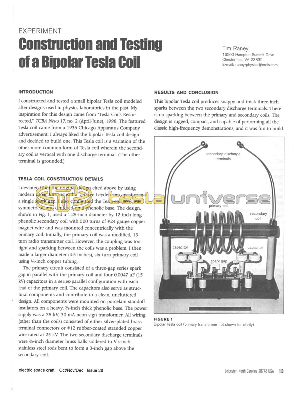 This bipolar Tesla coil produces snappy and thick three-inch sparks between the two secondary discharge terminals. There is no sparking between the primary and secondary coils. The design is rugged, compact, and capable of performing all the classic, high-frequency demonstrations, and it was fun to build.