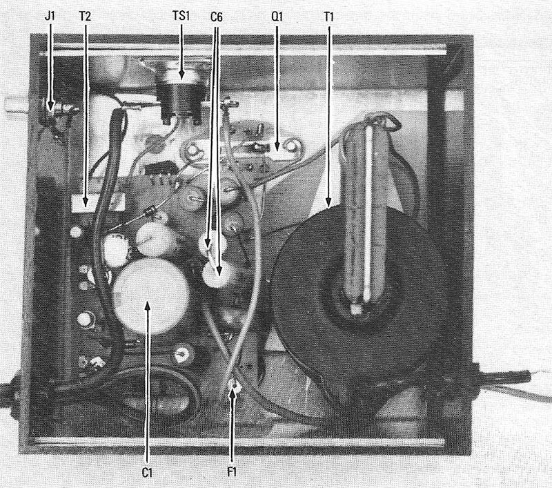 The metal frame chassis, which is called a mounting plate in the instructions packaged with the complete kit, also serves as the heat sink for Q1 and Q2, which is why thermal-switch TS1 is installed on the frame. If the frame gets excessively hot, TS1 opens and turns the power supply off. Since TS1 is self-resetting, it automatically restores power when the heat sink cools.
