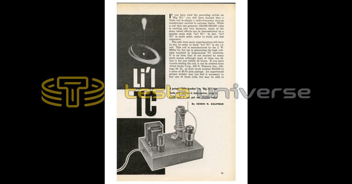 If you have read the preceding article on "Big TC," you will have learned that a Tesla coil is simply a radio-frequency step-up transformer carried to extreme limits. While a coil that can generate 150,000-200,000 volts is exciting and very dramatic, many of the same visual effects can be demonstrated on a smaller scale with "Li'l TC." In fact, "Li'l TC" is much safer, easier to build, and less expensive.