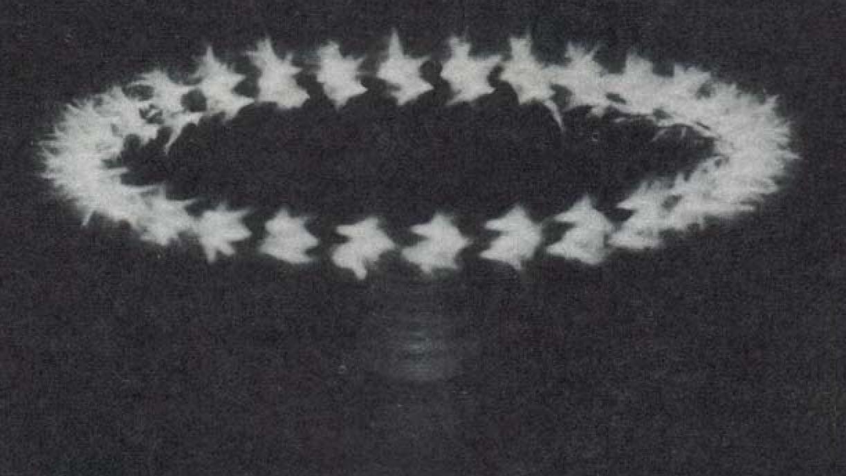 Another bit of fireworks results when you balance a wire rotor (detailed in the panel below) on the point of a phonograph needle erected on the terminal. Jet propulsion from the corona discharges at each end sets the rotor spinning. The result is a startling ring of fire.