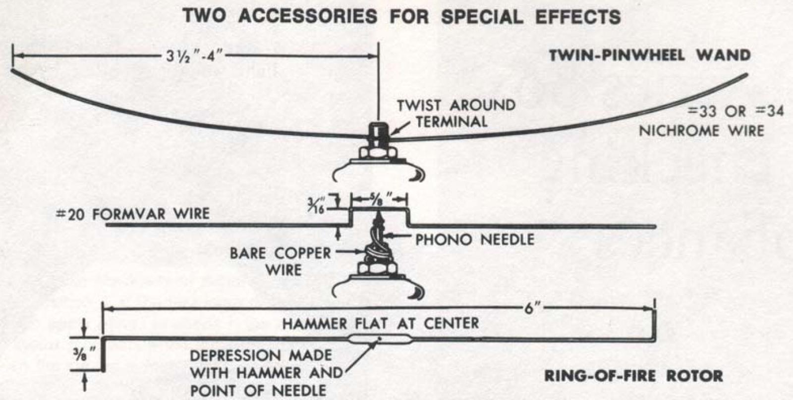 Spectacular fireworks include a ring of fire scribed by wire pivoting on a phonograph needle attached to a terminal. Finer wire, attached directly to coil, produces trumpet pinwheels above (details page 172).
