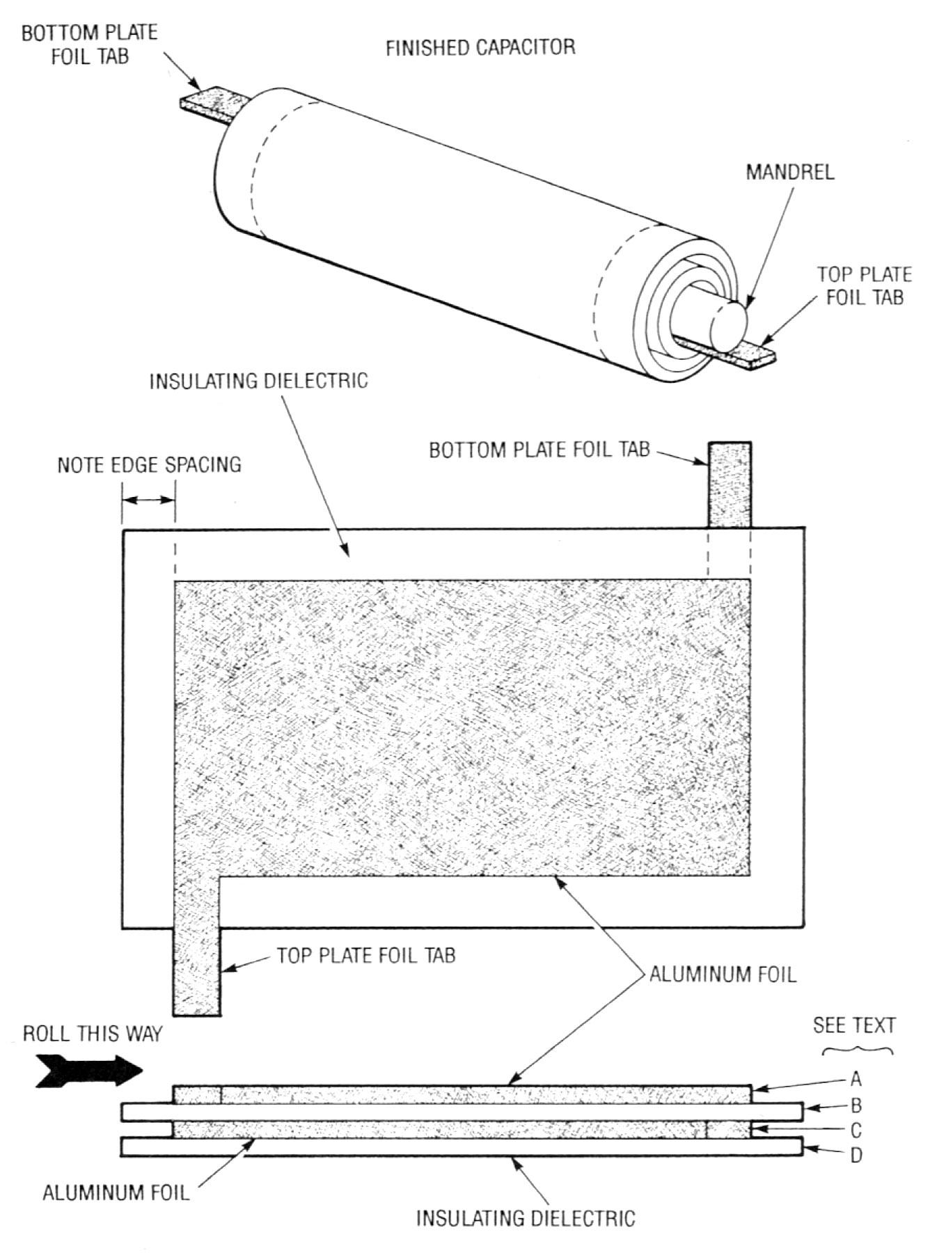 The kind of capacitor depicted in Fig. 4 can provide large capacitance in a small size. They are a little trickier to make than stacked-section type capacitors, so you might want to try a few small prototypes first. The design uses a layered approach (as shown), and we suggest using only one section as it is difficult to align and wrap multiple sections. By contrast, a single section several feet long is not too unwieldy.