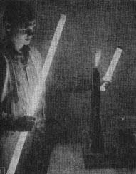 If you hold a clear 150-watt light bulb near the coil, the bulb will light up with a strange color combination (Fig. 6). This is thought to be due to the high-frequency energy ionizing the gas in the bulb. (Tesla noted the strange effect of flames inside a light bulb).