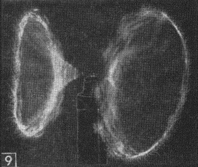 Another demonstration of the "skin" travel of high-frequency currents is to attach a 12-in. piece of fine nichrome or steel piano wire (about .007-.008 in.) on the coil terminal by twisting it around the screw at the center of the wire. Straighten out the wire to a horizontal position, and use an additional nut on the terminal screw to hold the wire in place. When power is turned on, a pair of brilliant arcs of lavender color will result as ends of the wire rotate at high speed. Examination of the wire will reveal that tiny discharges are breaking out all along the wire (Fig. 9). High-frequency current travels only over the surface of conductors and since the fine wire does not have adequate surface area, the discharges leap to the surrounding air. The rotation is probably due to the whipping or snapping effect resulting from applying high energy to an inadequate conductor.