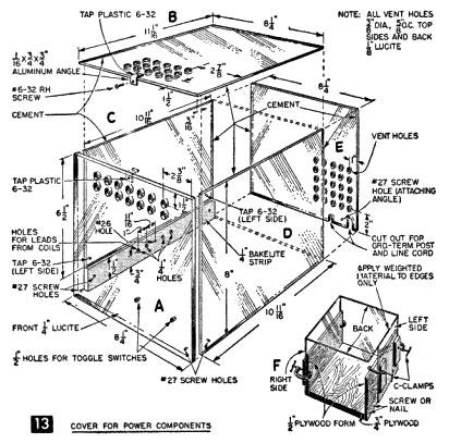 Cut four pieces of ⅛-in. clear Lucite (top, two sides and back) to dimensions shown in Fig. 13, drilling all holes required and making sure edges are square and true. Then, cement back to sides as described earlier. A cementing jig (Fig. 13-F) will facilitate assembly. Apply pressure with weighted material immediately after applying cement and let dry for several hours. Then, cement top to sides and back, again using adequate pressure. Attach an aluminum angle to top with a #6-32 rh screw (Fig. 13-B) and cover-assembly top to front with a #6-32 rh screw (Fig. 13-A). Attach left side (which rests on Bakelite strip) to strip with two #6-32 rh screws, one each front and back (Fig. 12-Ga). Finally, attach cover assembly to plywood base with two aluminum angles and #6-32 rh screws located at right side and back between line cord and terminal post (Figs. 12-Eb, and 14). To prevent accidental shock from the primary coil, cement to coil base a ⅛" x 5" x 5½" O.D. clear Lucite cylinder (Fig. 3-A) as in Fig. 12.