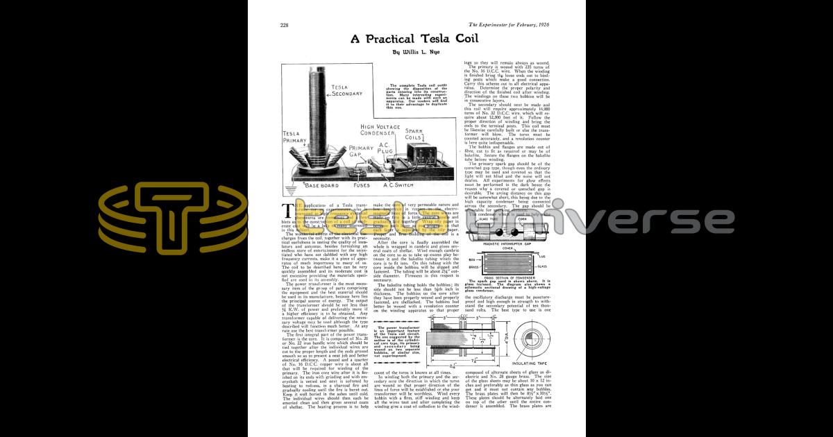 The applications of a Tesla transformer for an experimenter who is interested in high frequency electrical phenomena are numerous and a few hints as to the construction of a coil of moderate cost will be a help to many interested in this subject.