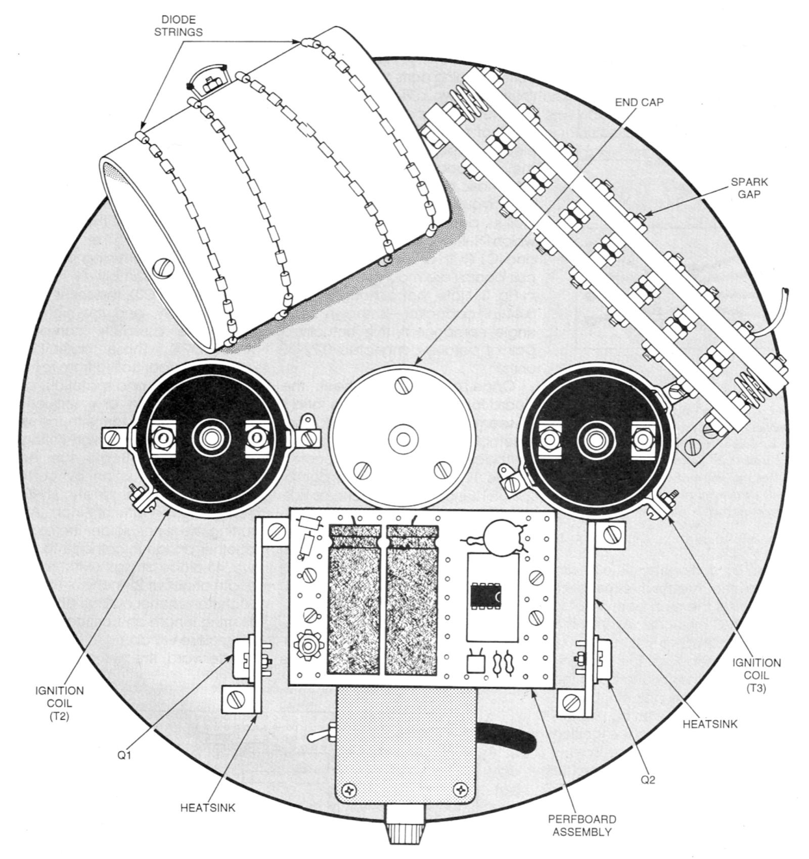 Begin by cutting the pine-board stock to the required dimension. After cutting the pine-board stock, a 2-inch PVC end cap was mounted open-end up to the center of the round baseboard. The two ignition coils were then mounted to the baseboard using a pair of L-brackets; plumber's tape can be used to secure the L brackets to the ignition coils. Or, if you prefer, large screw-type hose clamps can be used to secure the L-brackets to their respective ignition coils. After securing the ignition coils in position, mount T1 to the baseboard.