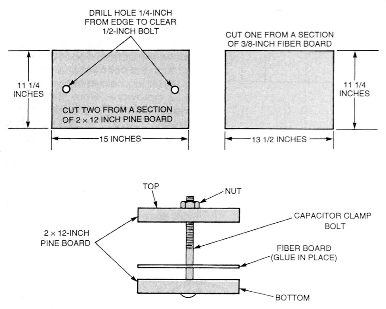Capacitor C3 is a homemade unit comprised of 33 sheets of aluminum flashing and 34 sheets of plastic material sandwiched between a couple of pieces of pine board (which we'll hereafter refer to as a clamp). Begin this phase of construction by manufacturing the capacitor clamp. The capacitor clamp is comprised of a pair of 15 x 11 1/4-inch end pieces cut from 2-inch thick length of pine wood, a 13 1/2- x 11 1/4-inch piece of 3/8-inch thick fiber board, and two 8-inch x 1/2-inch carriage bolts (see Fig. 7 for details). After cutting the pine and fiber boards to the dimensions indicated in Fig. 7 and drilling holes as required, glue the fiber board section to the bottom of the capacitor clamp, as shown. When the clamp is ready, prepare the capacitor's dielectric and electrical plates.