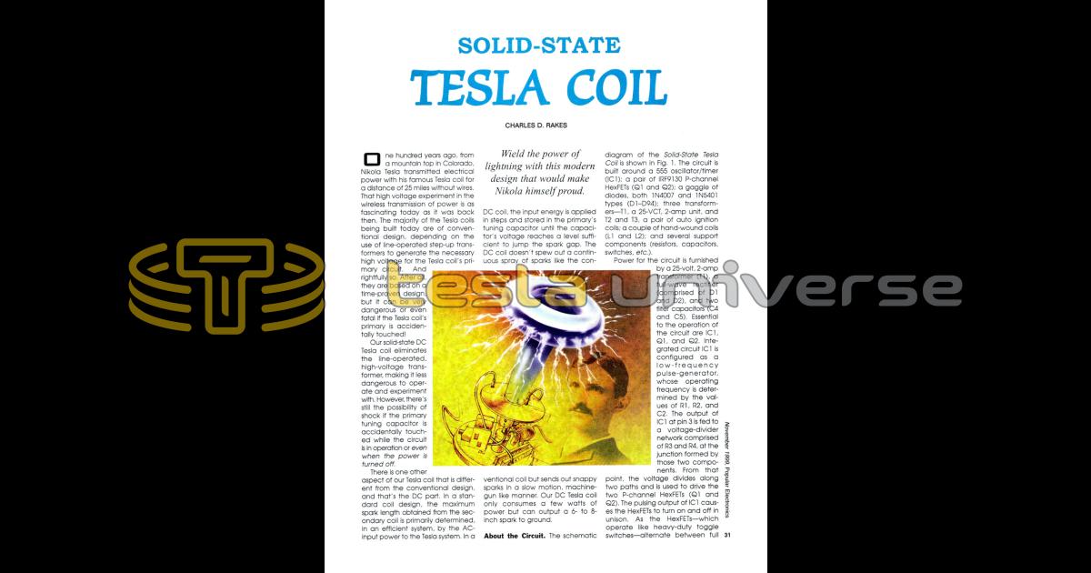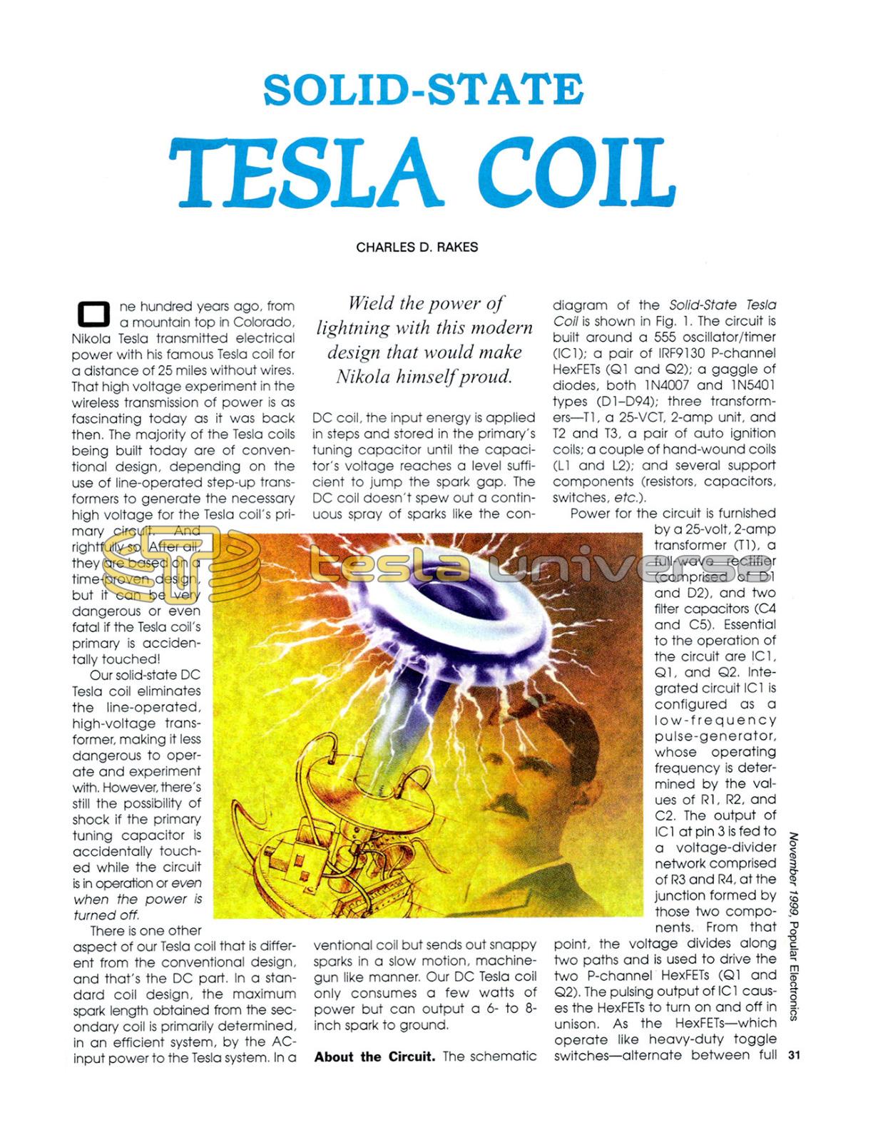 One hundred years ago, from a mountain top in Colorado, Nikola Tesla transmitted electrical power with his famous Tesla coil for a distance of 25 miles without wires. That high voltage experiment in the wireless transmission of power is as fascinating today as it was back then. The majority of the Tesla coils being built today are of conventional design, depending on the use of line-operated step-up transformers to generate the necessary high voltage for the Tesla coil's primary circuit. And rightfully so. After all, they are based on a time-proven design, but it can be very dangerous or even fatal if the Tesla coil's primary is accidentally touched!