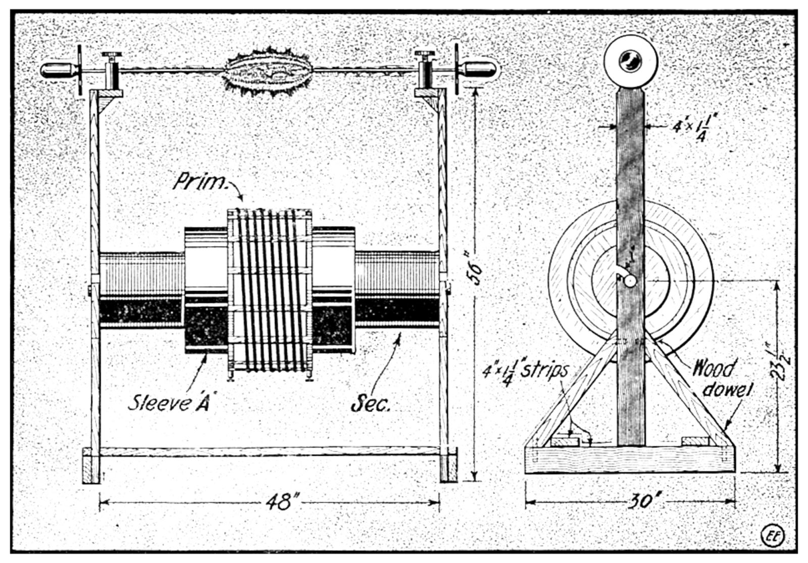The dimensions for the large Tesla coil to be used with this outfit, capable of producing 30 to 36" high frequency sparks when all of the apparatus is properly tuned and adjusted, are given at Figs. 2 and 2A. This special large size, extra high voltage, high frequency air core transformer, is built at small cost and consists of a primary and secondary coil as usual, as well as an insulating sleeve A, ¾" thick, made of shellacked paper or oiled linen.