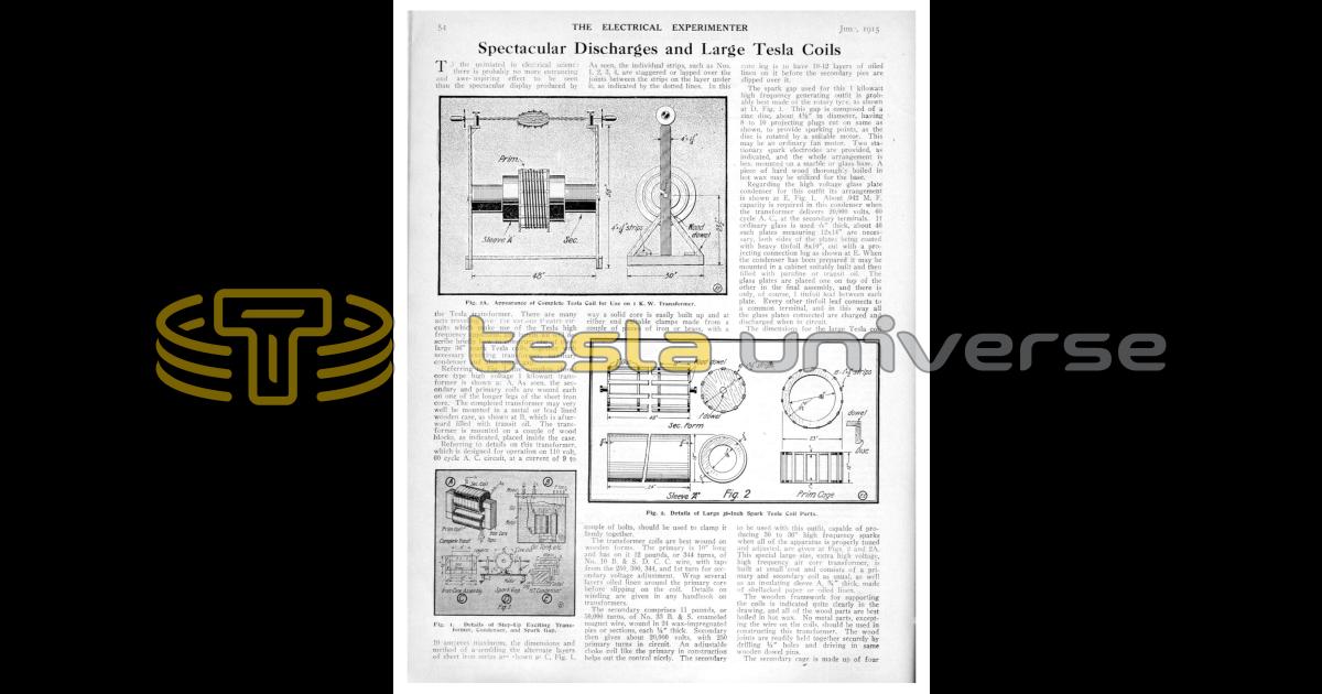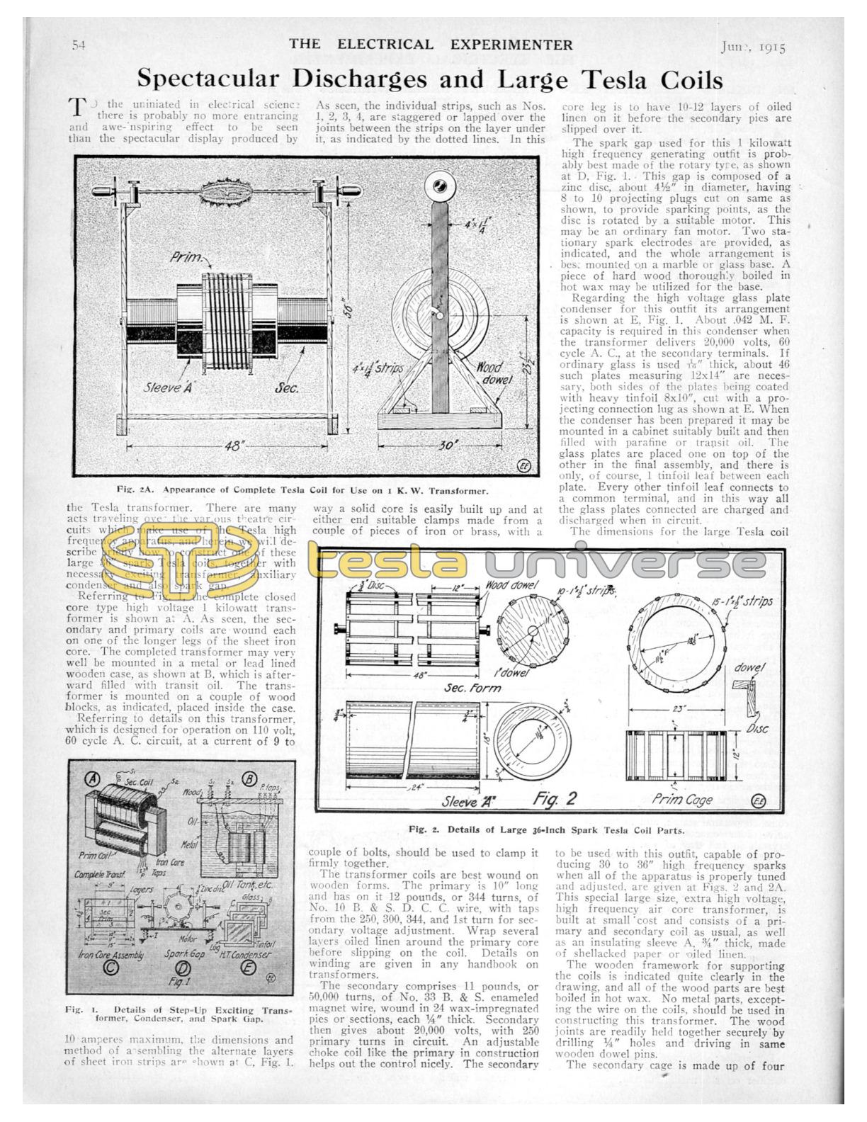To the uniniated in electrical science there is probably no more entrancing and awe-inspiring effect to be seen than the spectacular display produced by the Tesla transformer. There are many acts traveling over the various theatre circuits which make use of the Tesla high frequency apparatus, and herein we will describe briefly how to construct one of these large 36" spark Tesla coils, together with necessary exciting transformer, auxiliary condenser and also spark gap.