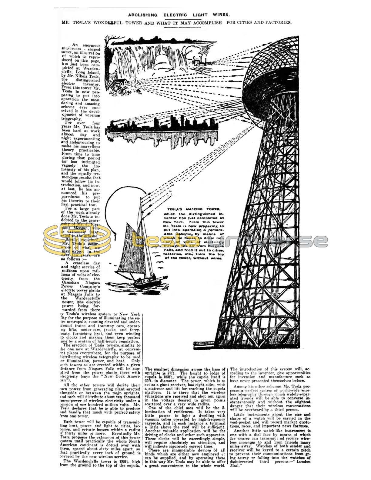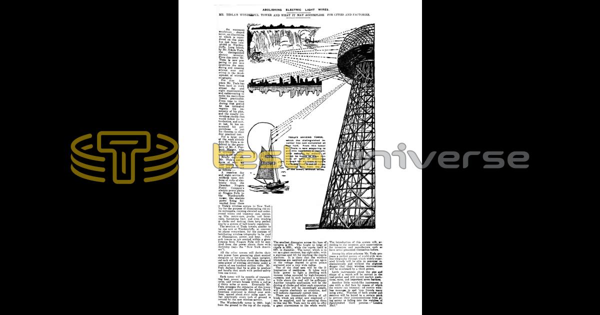 An enormous mushroom shaped tower, an Illustration of which is reproduced on this page, his just been completed at Wardenclyffe, Long Island, by Mr. Nikola Tesla, the distinguished electric inventor. From this tower Mr. Tesla is now pre paring to put into operation the most daring and amazing scheme ever conceived in the development of wireless telegraphy.