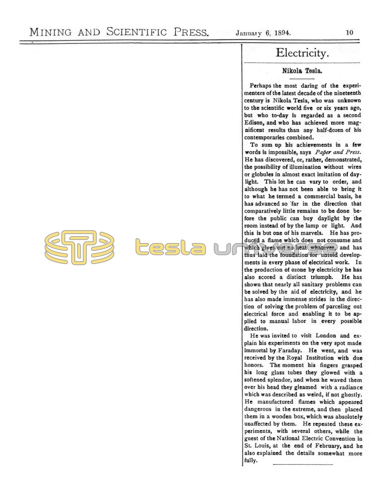 To sum up his achievements in a few words is impossible, says Paper and Press. He has discovered, or, rather, demonstrated, the possibility of illumination without wires or globules in almost exact imitation of daylight. This lot he can vary to order, and although he has not been able to bring it to what he termed a commercial basis, he has advanced so far in the direction that comparatively little remains to be done before the public can buy daylight by the room instead of by the lamp or light. And this is but one of his marvels. He has produced a flame which does not consume and which gives out no heat whatever, and has thus laid the foundation for untold developments in every phase of electrical work. In the production of ozone by electricity he has also scored a distinct triumph. He has shown that nearly all sanitary problems can be solved by the aid of electricity, and he has also made immense strides in the direction of solving the problem of parceling out electrical force and enabling it to be applied to manual labor in every possible direction.