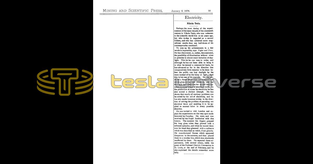 Perhaps the most daring of the experimenters of the latest decade of the nineteenth century is Nikola Tesla, who was unknown to the scientific world five or six years ago, but who to-day is regarded as a second Edison, and who has achieved more magnificent results than any half-dozen of his contemporaries combined.