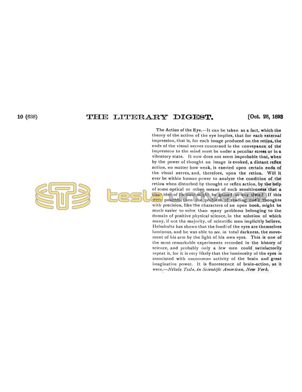 It can be taken as a fact, which the theory of the action of the eye implies, that for each external impression, that is, for each image produced on the retina, the ends of the visual nerves concerned in the conveyance of the impression to the mind must be under a peculiar stress or in a vibratory state. It now does not seem improbable that, when by the power of thought an image is evoked, a distant reflex action, no matter how weak, is exerted upon certain ends of the visual nerves, and, therefore, upon the retina. Will it ever be within human power to analyze the condition of the retina when disturbed by thought or reflex action, by the help of some optical or other means of such sensitiveness that a clear idea of its state might be gained at any time? If this were possible, then the problem of reading one's thoughts with precision, like the characters of an open book, might be much easier to solve than many problems belonging to the domain of positive physical science, in the solution of which many, if not the majority, of scientific men implicitly believe. Helmholtz has shown that the fundi of the eyes are themselves luminous, and he was able to see, in total darkness, the movement of his arm by the light of his own eyes. This is one of the most remarkable experiments recorded in the history of science, and probably only a few men could satisfactorily repeat it, for it is very likely that the luminosity of the eyes is associated with uncommon activity of the brain and great imaginative power. It is fluorescence of brain-action, as it were. — Nikola Tesla, in Scientific American, New York.