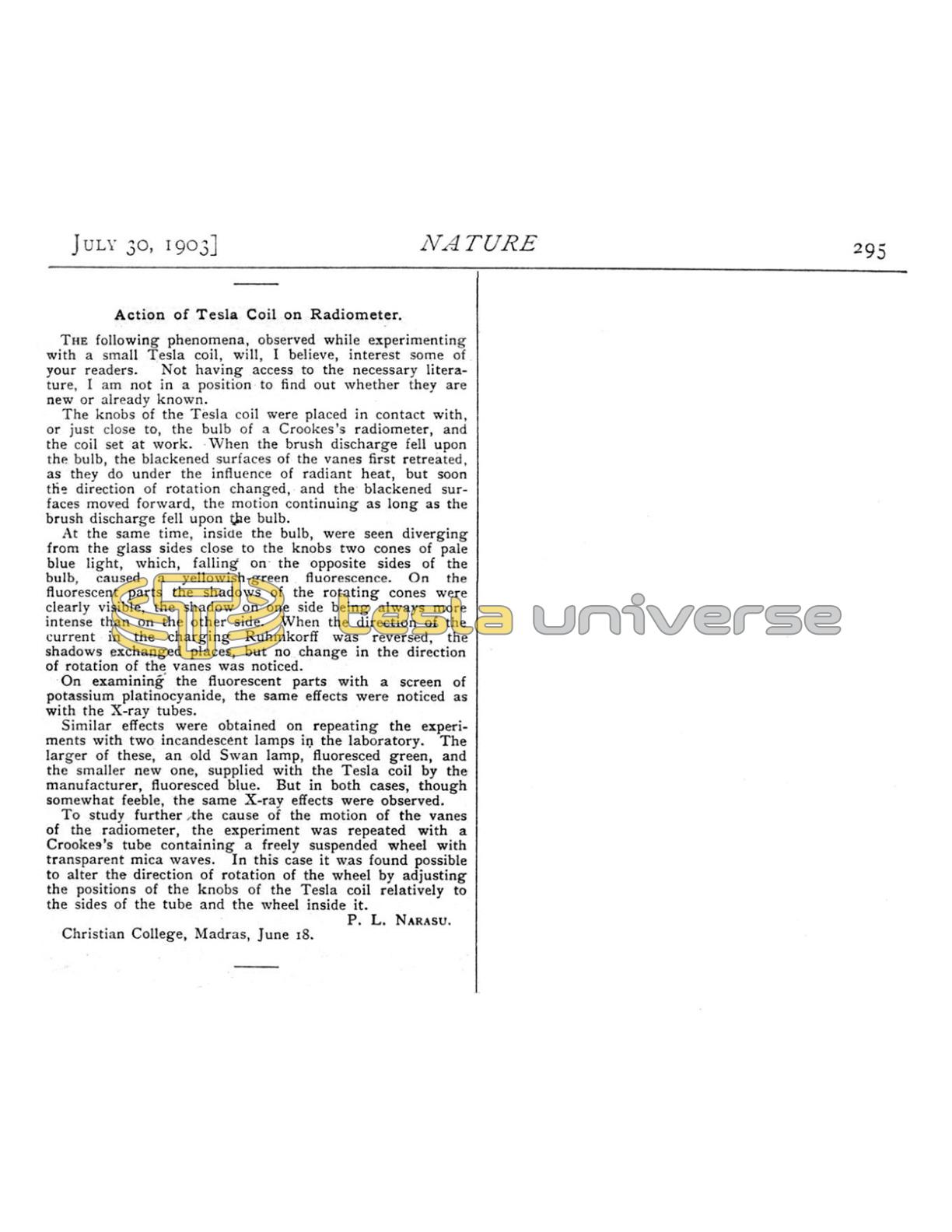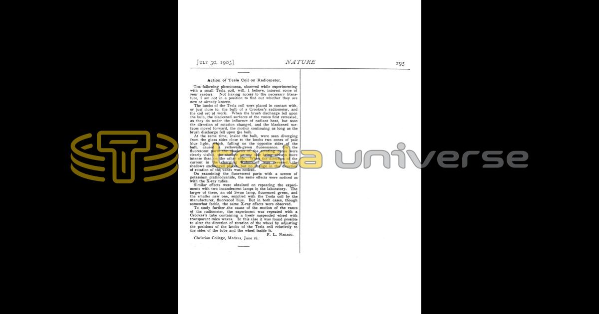 To study further the cause of the motion of the vanes of the radiometer, the experiment was repeated with a Crookes's tube containing a freely suspended wheel with transparent mica waves. In this case it was found possible to alter the direction of rotation of the wheel by adjusting the positions of the knobs of the Tesla coil relatively to the sides of the tube and the wheel inside it.