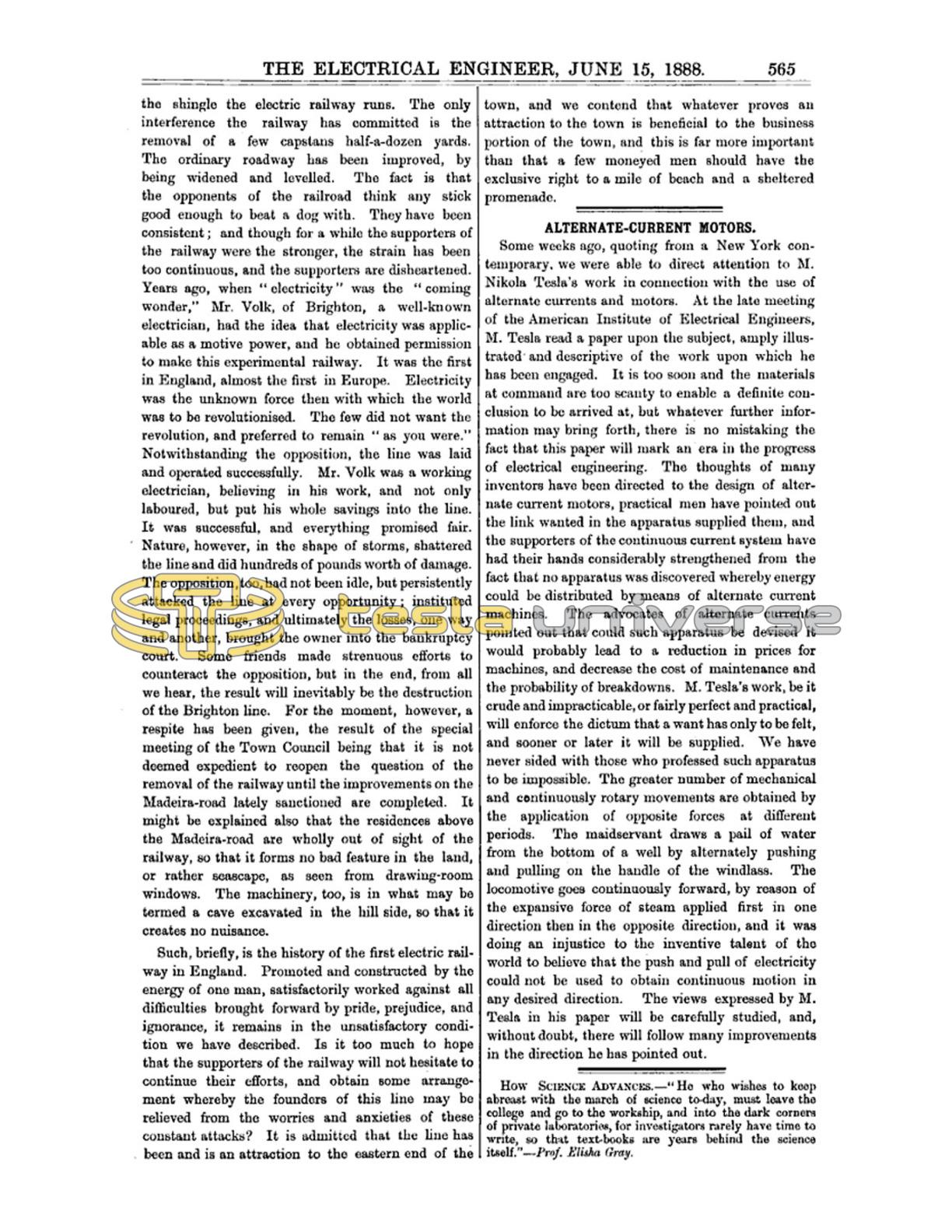 Some weeks ago, quoting from a New York contemporary, we were able to direct attention to M. Nikola Tesla’s work in connection with the use of alternate currents and motors. At the late meeting of the American Institute of Electrical Engineers, M. Tesla read a paper upon the subject, amply illustrated and descriptive of the work upon which he has been engaged. It is too soon and the materials at command are too scanty to enable a definite conclusion to be arrived at, but whatever further information may bring forth, there is no mistaking the fact that this paper will mark an era in the progress of electrical engineering. The thoughts of many inventors have been directed to the design of alternate current motors, practical men have pointed out the link wanted in the apparatus supplied them, and the supporters of the continuous current system have had their hands considerably strengthened from the fact that no apparatus was discovered whereby energy could be distributed by means of alternate current machines. The advocates of alternate currents pointed out that could such apparatus be devised it would probably lead to a reduction in prices for machines, and decrease the cost of maintenance and the probability of breakdowns. M. Tesla’s work, be it crude and impracticable, or fairly perfect and practical, will enforce the dictum that a want has only to be felt, and sooner or later it will be supplied. We have never sided with those who professed such apparatus to be impossible. The greater number of mechanical and continuously rotary movements are obtained by the application of opposite forces at different periods. The maidservant draws a pail of water from the bottom of a well by alternately pushing and pulling on the handle of the windlass. The locomotive goes continuously forward, by reason of the expansive force of steam applied first in one direction then in the opposite direction, and it was doing an injustice to the inventive talent of the world to believe that the push and pull of electricity could not be used to obtain continuous motion in any desired direction. The views expressed by M. Tesla in his paper will be carefully studied, and, without doubt, there will follow many improvements in the direction he has pointed out.