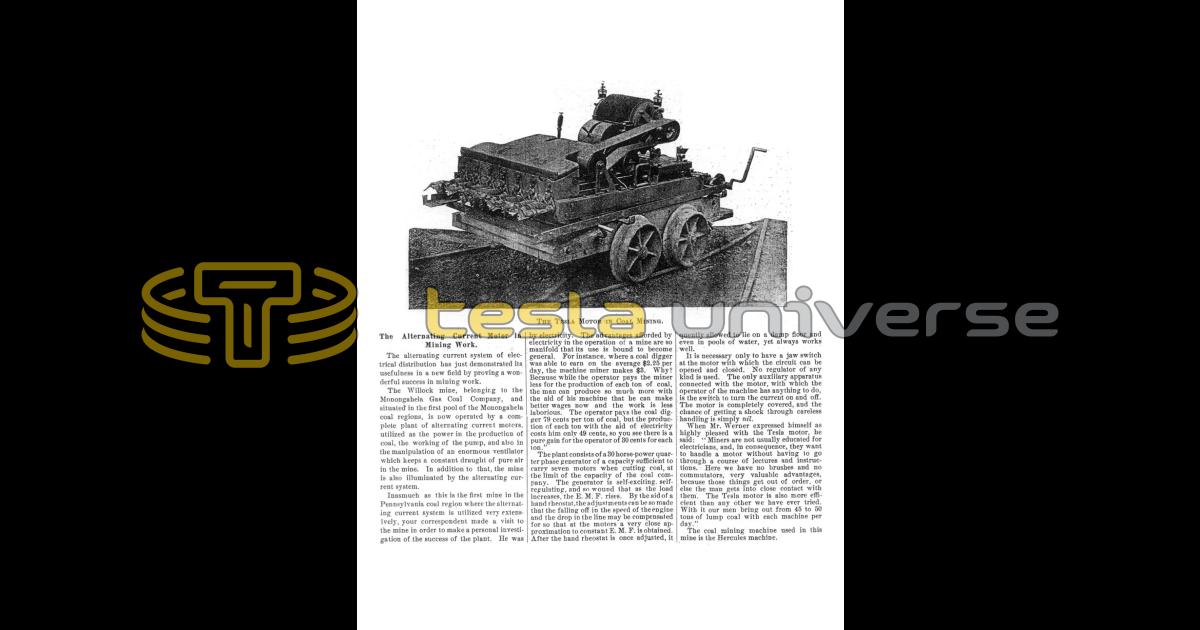 When Mr. Werner expressed himself as highly pleased with the Tesla motor, he said: “Miners are not usually educated for electricians, and, in consequence, they want to handle a motor without having to go through a course of lectures and instructions. Here we have no brushes and no commutators, very valuable advantages, because those things get out of order, or else the man gets into close contact with them. The Tesla motor is also more efficient than any other we have ever tried. With it our men bring out from 45 to 50 tons of lump coal with each machine per day.”