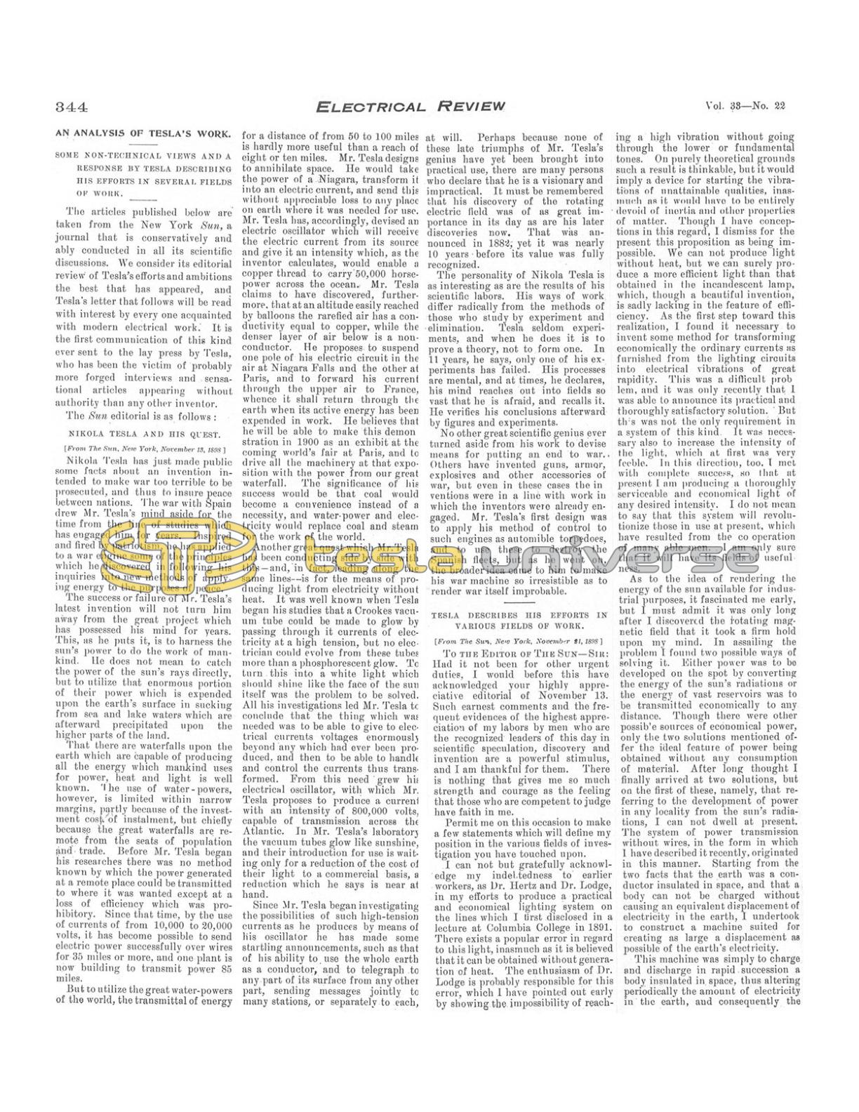 The articles published below are taken from the New York Sun, a journal that is conservatively and ably conducted in all its scientific discussions. We consider its editorial review of Tesla’s efforts and ambitions the best that has appeared, and Tesla's letter that follows will be read with interest by every one acquainted with modern electrical work. It is the first communication of this kind ever sent to the lay press by Tesla, who has been the victim of probably more forged interviews and sensational articles appearing without authority than any other inventor.