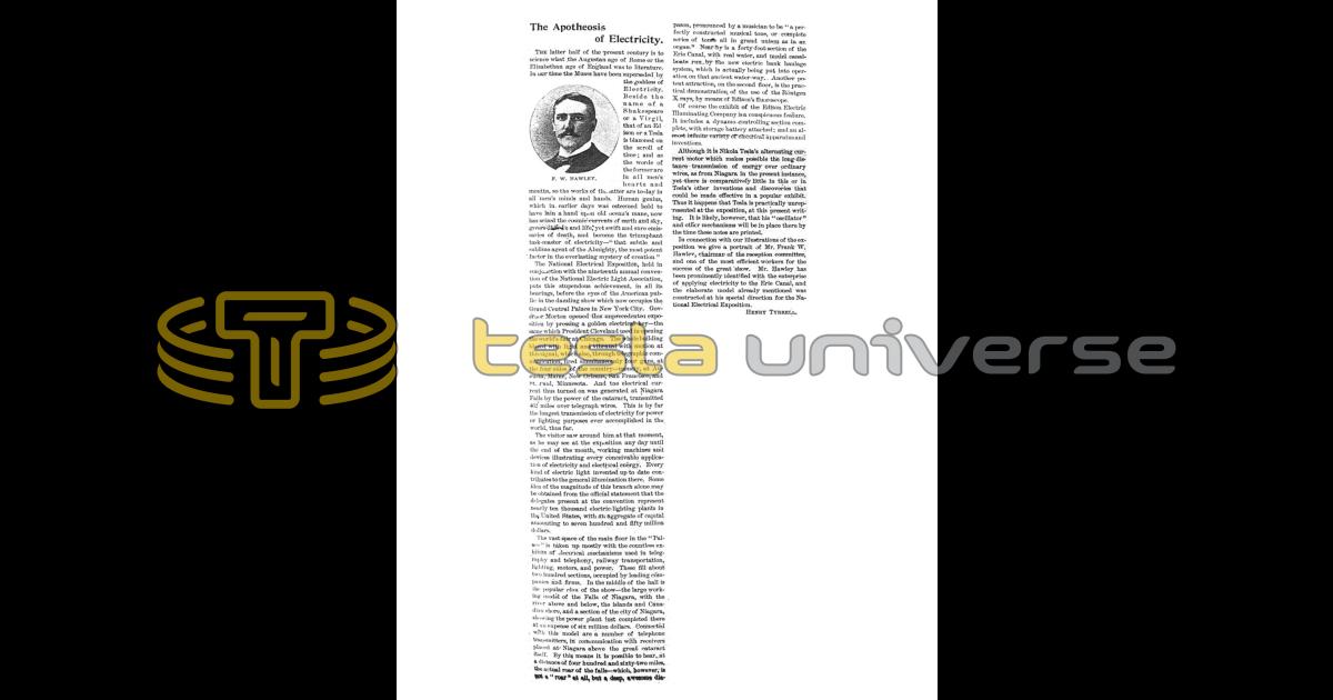 Although it is Nikola Tesla's alternating current motor which makes possible the long-distance transmission of energy over ordinary wires, as from Niagara in the present instance, yet there is comparatively little in this or in Tesla's other inventions and discoveries that could be made effective in a popular exhibit. Thus it happens that Tesla is practically unrepresented at the exposition, at this present writing. It is likely, however, that his "oscillator" and other mechanisms will be in place there by the time these notes are printed.