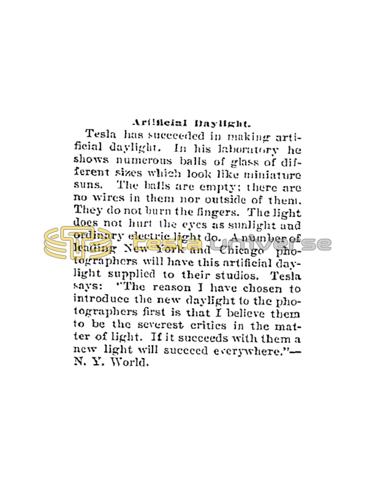 Tesla has succeeded in making artificial daylight. In his laboratory he shows numerous balls of glass of different sizes which look like miniature suns. The balls are empty: there are no wires in them nor outside of them. They do not burn the fingers. The light does not hurt the eyes as sunlight and ordinary electric light do. A number of leading New York and Chicago photographers will have this artificial daylight supplied to their studios. Tesla says: “The reason I have chosen to introduce the new daylight to the photographers first is that I believe them to be the severest critics in the matter of light. If it succeeds with them a new light will succeed everywhere.” - N. Y. World.