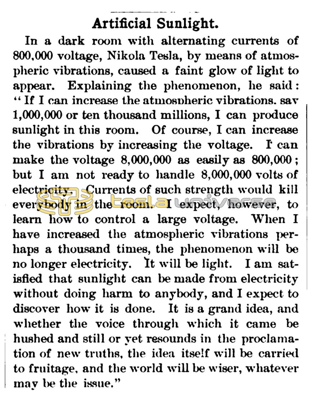 In a dark room with alternating currents of 800,000 voltage, Nikola Tesla, by means of atmospheric vibrations, caused a faint glow of light to appear. Explaining the phenomenon, he said: “If I can increase the atmospheric vibrations, say 1,000,000 or ten thousand millions, I can produce sunlight in this room. Of course, I can increase the vibrations by increasing the voltage. I can make the voltage 8,000,000 as easily as 800,000; but I am not ready to handle 8,000,000 volts of electricity. Currents of such strength would kill everybody in the room. I expect, however, to learn how to control a large voltage. When I have increased the atmospheric vibrations perhaps a thousand times, the phenomenon will be no longer electricity. It will be light. I am satisfied that sunlight can be made from electricity without doing harm to anybody, and I expect to discover how it is done. It is a grand idea, and whether the voice through which it came be hushed and still or yet resounds in the proclamation of new truths, the idea itself will be carried to fruitage, and the world will be wiser, whatever may be the issue.”