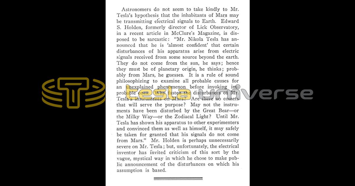 Astronomers do not seem to take kindly to Mr. Tesla's hypothesis that the inhabitants of Mars may be transmitting electrical signals to Earth. Edward S. Holden, formerly director of Lick Observatory, in a recent article in McClure's Magazine, is disposed to be sarcastic: "Mr. Nikola Tesla has announced that he is 'almost confident' that certain disturbances of his apparatus arise from electric signals received from some source beyond the earth. They do not come from the sun, he says; hence they must be of planetary origin, he thinks; probably from Mars, he guesses. It is a rule of sound philosophizing to examine all probable causes for an unexplained phenomenon before invoking improbable ones. Why fasten the disturbances of Mr. Tesla's instruments on Mars? Are there no comets that will serve the purpose? May not the instruments have been disturbed by the Great Bear — or the Milky Way — or the Zodiacal Light? Until Mr. Tesla has shown his apparatus to other experimenters and convinced them as well as himself, it may safely be taken for granted that his signals do not come from Mars." Mr. Holden is perhaps unnecessarily severe on Mr. Tesla; but, unfortunately, the electrical inventor has invited criticism of this sort by the vague, mystical way in which he chose to make public announcement of the disturbances on which his assumption is based.