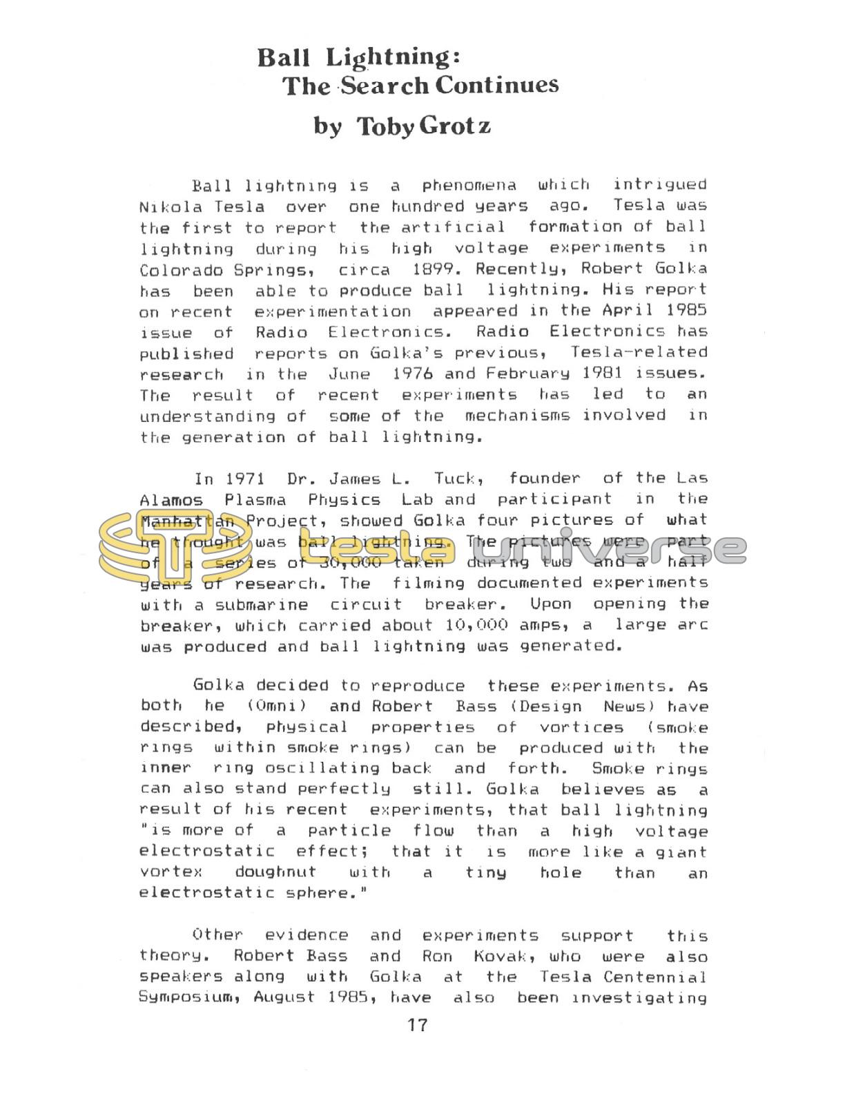 Other evidence and experiments support this theory. Robert Bass and Ron Kovak, who were also speakers along with Golka at the Tesla Centennial Symposium, August 1985, have also been investigating ball lightning. Bass and Golka have mathematically predicted the size of ball lightning. Kovak has photographed the effect using a large Tesla coil. The size of the fireball measured from enlargements of his photograph have confirmed the predicted model. Kovak is presently in the process of duplicating the effect with a full compliment of instrumentation designed to observe the spectral emissions in both the visible and radio frequency portions of the electromagnetic spectrum.