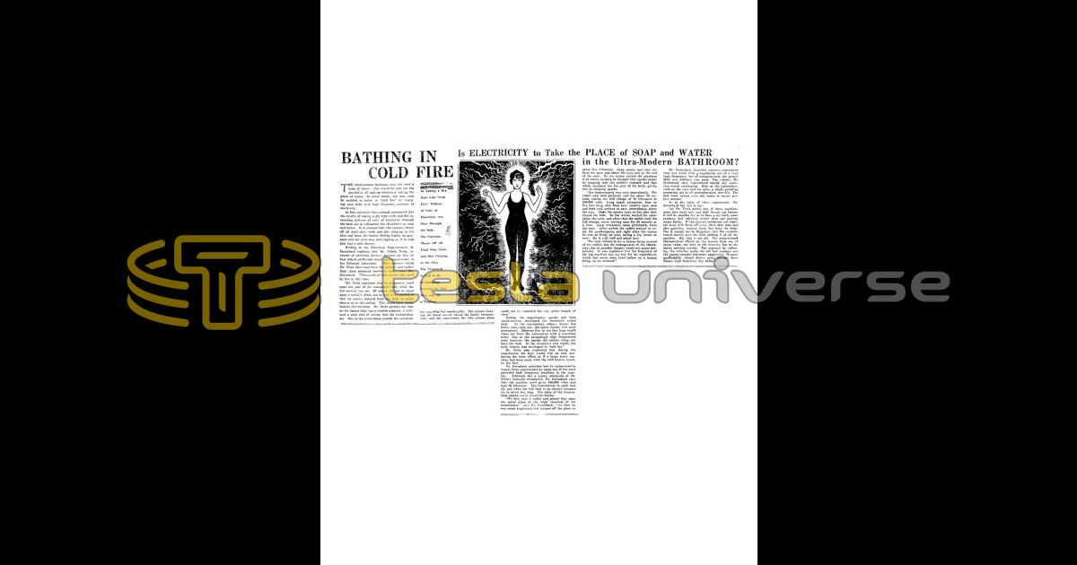 “As Dr. Tesla points out, if these machines come into daily use, and duly invade our homes. it will be possible for us to have a dry bath, more sanitary and infinitely better than our present water baths. If the current conditions are right. the body will throw off scale, dead skin, dust and dirt particles, hurling them far from the body. For it should not be forgotten that the currents travel mostly over the skin, ridding it of all impurities. But that is not all. The unquestioned therapeutical effects on the human body are of great value, not only to the muscles, but to the entire nervous system. The currents, by softening the arteries, make the old feel younger and the young younger and more aggressive. Women, particularly. should derive great benefits from future high frequency dry baths."