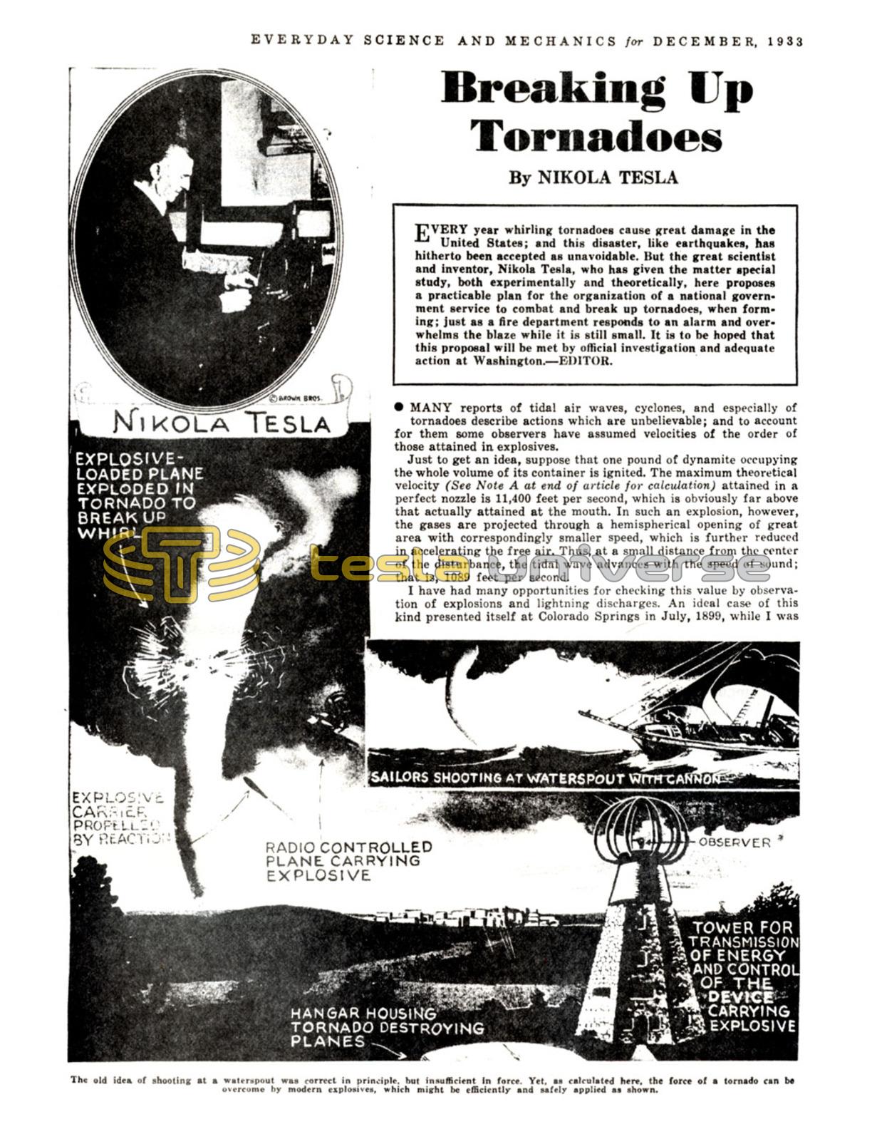 Every year whirling tornadoes cause great damage in the United States; and this disaster, like earthquakes, has hitherto been accepted as unavoidable. But the great scientist and inventor, Nikola Tesla. who has given the matter special study, both experimentally and theoretically, here proposes a practicable plan for the organization of a national government service to combat and break up tornadoes, when forming; just as a fire department responds to an alarm and overwhelms the blaze while it is still small. It is to be hoped that this proposal will be met by official investigation and adequate action at Washington. — EDITOR.