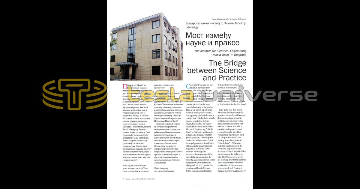 An elegantly decorated catalogue was published on the occasion of this event, with unusual “genealogy” on the last page. Everything that was developed under the roof of the Institute is illustrated schematically in it. What an amazing discovery! One after the other: The Institute “Nikola Tesla”, The Institute for Electric Engineering of the SANU, The Institute for Electric Power Researches, The Hydroelectric Institute, from which the Institute “Jaroslav Cerni” was derived, then the Institute “Milan Vidmar” in Ljubljana, The Institute “Mihailo Pupin”... Of course, we refer to the leading scientific and research institutions of the former Yugoslavia, and present-day Serbia. We should undoubtedly attach to this impressive list the Museum of Nikola Tesla in Belgrade, which is the distinctive monument (mausoleum) of the famous monk of science.