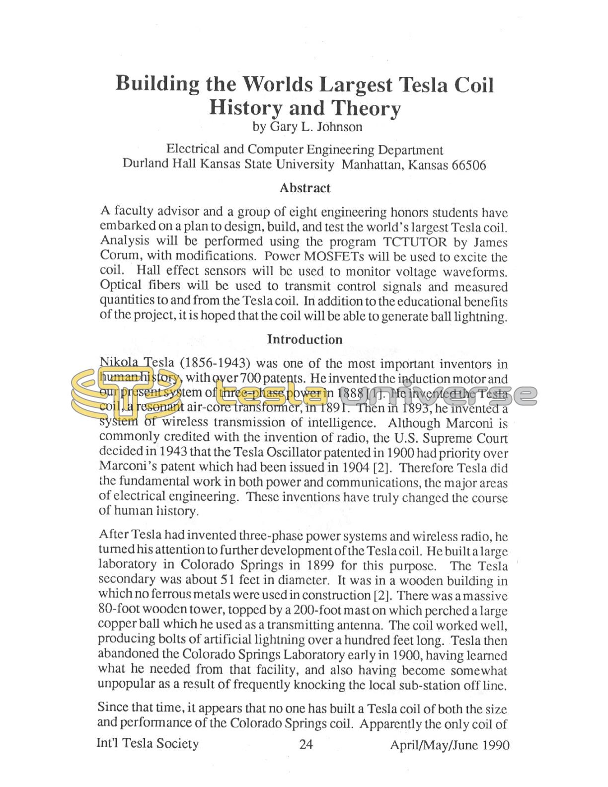 4. Grotz, Toby, 'Project Tesla - An Update', Tesla Coil Builders Association News, Volume 9, No.1, January, Febuary, March, 1990, pp.16-18.