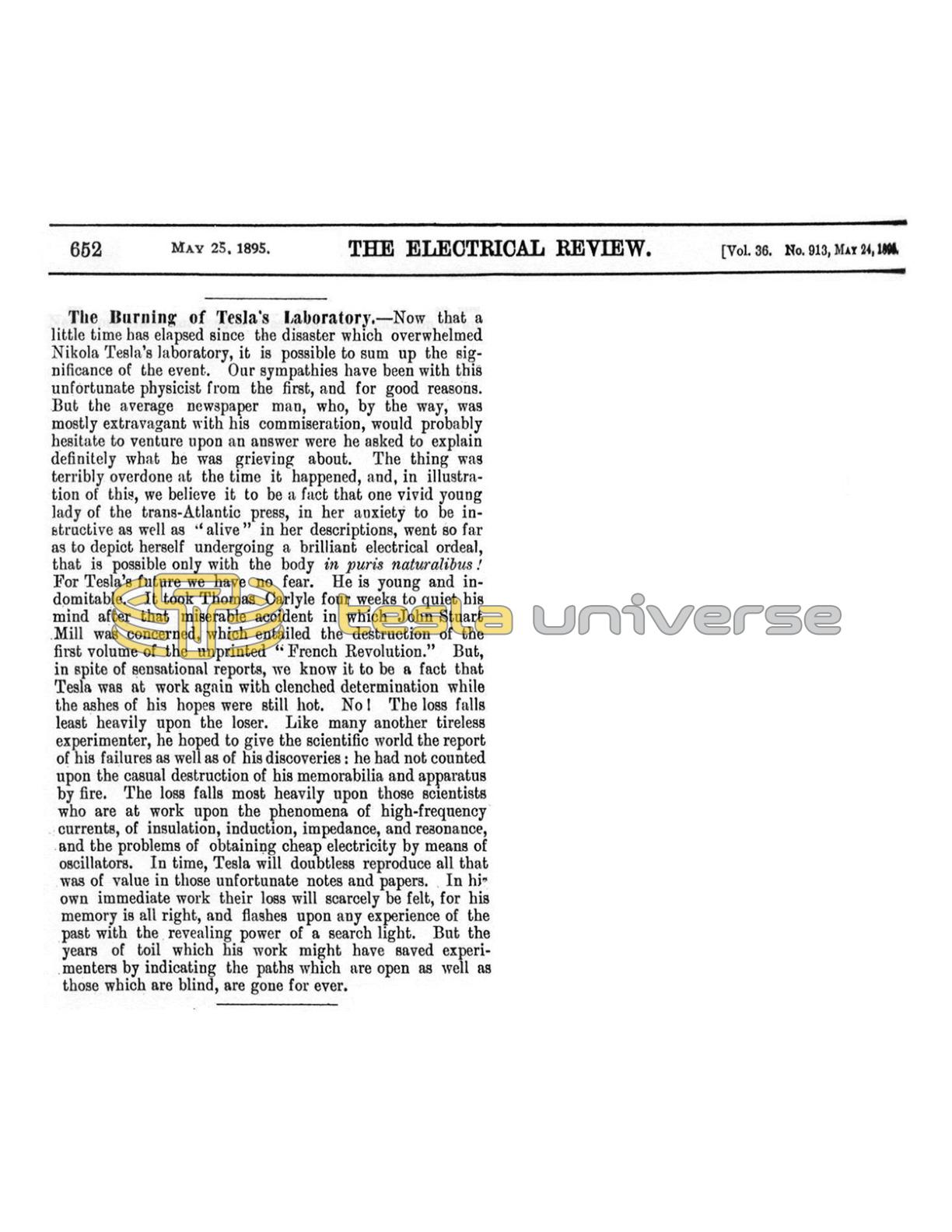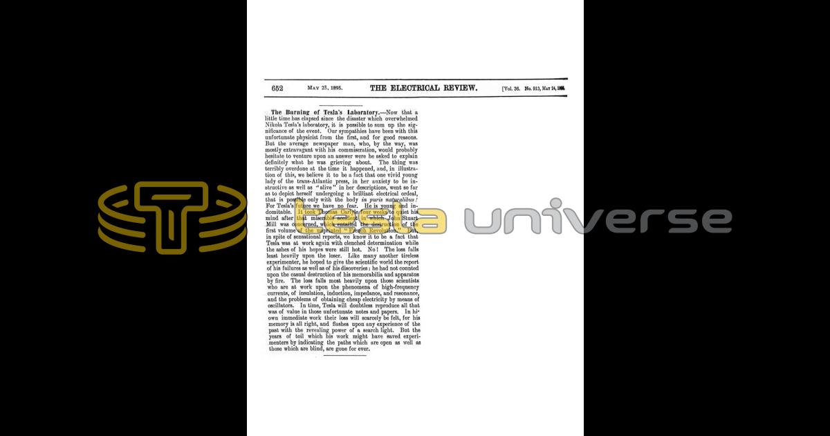 Now that a little time has elapsed since the disaster which overwhelmed Nikola Tesla's laboratory, it is possible to sum up the significance of the event. Our sympathies have been with this unfortunate physicist from the first, and for good reasons. But the average newspaper man, who, by the way, was mostly extravagant with his commiseration, would probably hesitate to venture upon an answer were he asked to explain definitely what he was grieving about. The thing was terribly overdone at the time it happened, and, in illustration of this, we believe it to be a fact that one vivid young lady of the trans-Atlantic press, in her anxiety to be instructive as well as "alive" in her descriptions, went so far as to depict herself undergoing a brilliant electrical ordeal, that is possible only with the body in puris naturalibus! For Tesla's future we have no fear. He is young and indomitable. It took Thomas Carlyle four weeks to quiet his mind after that miserable accident in which John Stuart Mill was concerned, which entailed the destruction of the first volume of the unprinted "French Revolution." But, in spite of sensational reports, we know it to be a fact that Tesla was at work again with clenched determination while the ashes of his hopes were still hot. No! The loss falls least heavily upon the loser. Like many another tireless experimenter, he hoped to give the scientific world the report of his failures as well as of his discoveries: he had not counted upon the casual destruction of his memorabilia and apparatus by fire. The loss falls most heavily upon those scientists who are at work upon the phenomena of high-frequency currents, of insulation, induction, impedance, and resonance, and the problems of obtaining cheap electricity by means of oscillators. In time, Tesla will doubtless reproduce all that was of value in those unfortunate notes and papers. In hi own immediate work their loss will scarcely be felt, for his memory is all right, and flashes upon any experience of the past with the revealing power of a search light. But the years of toil which his work might have saved experimenters by indicating the paths which are open as well as those which are blind, are gone for ever.