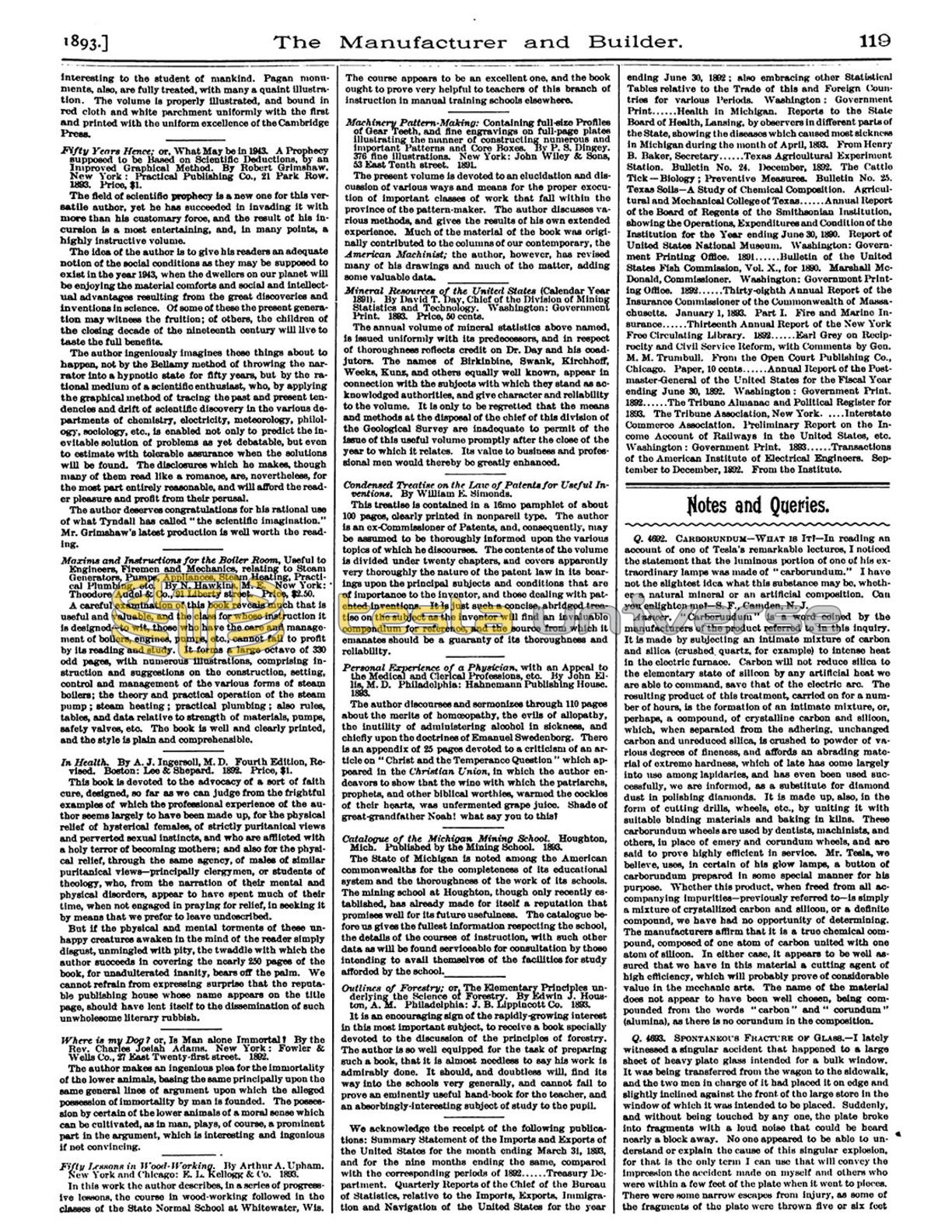 Answer. “Carborundum” is a word coined by the manufacturers of the product referred to in this inquiry. It is made by subjecting an intimate mixture of carbon and silica (crushed quartz, for example) to intense heat in the electric furnace. Carbon will not reduce silica to the elementary state of silicon by any artificial heat we are able to command, save that of the electric arc. The resulting product of this treatment, carried on for a number of hours, is the formation of an intimate mixture, or, perhaps, a compound, of crystalline carbon and silicon, which, when separated from the adhering, unchanged carbon and unreduced silica, is crushed to powder of various degrees of fineness, and affords an abrading material of extreme hardness, which of late has come largely into use among lapidaries, and has even been used successfully, we are informed, as a substitute for diamond dust in polishing diamonds. It is made up, also, in the form of cutting drills, wheels, etc., by uniting it with suitable binding materials and baking in kilns. These carborundum wheels are used by dentists, machinists, and others, in place of emery and corundum wheels, and are said to prove highly efficient in service. Mr. Tesla, we believe uses, in certain of his glow lamps, a button of carborundum prepared in some special manner for his purpose. Whether this product, when freed from all accompanying impurities — previously referred to — is simply a mixture of crystalized carbon and silicon, or a definite compound, we have had no opportunity of determining. The manufacturers affirm that it is a true chemical compound, composed of one atom of carbon united with one atom of silicon. In either case, it appears to be well assured that we have in this material a cutting agent of high efficiency, which will probably prove of considerable value in the mechanic arts. The name of the material does not appear to have been well chosen, being compounded from the words “carbon” and “corundum” (alumina), as there is no corundum in the composition.