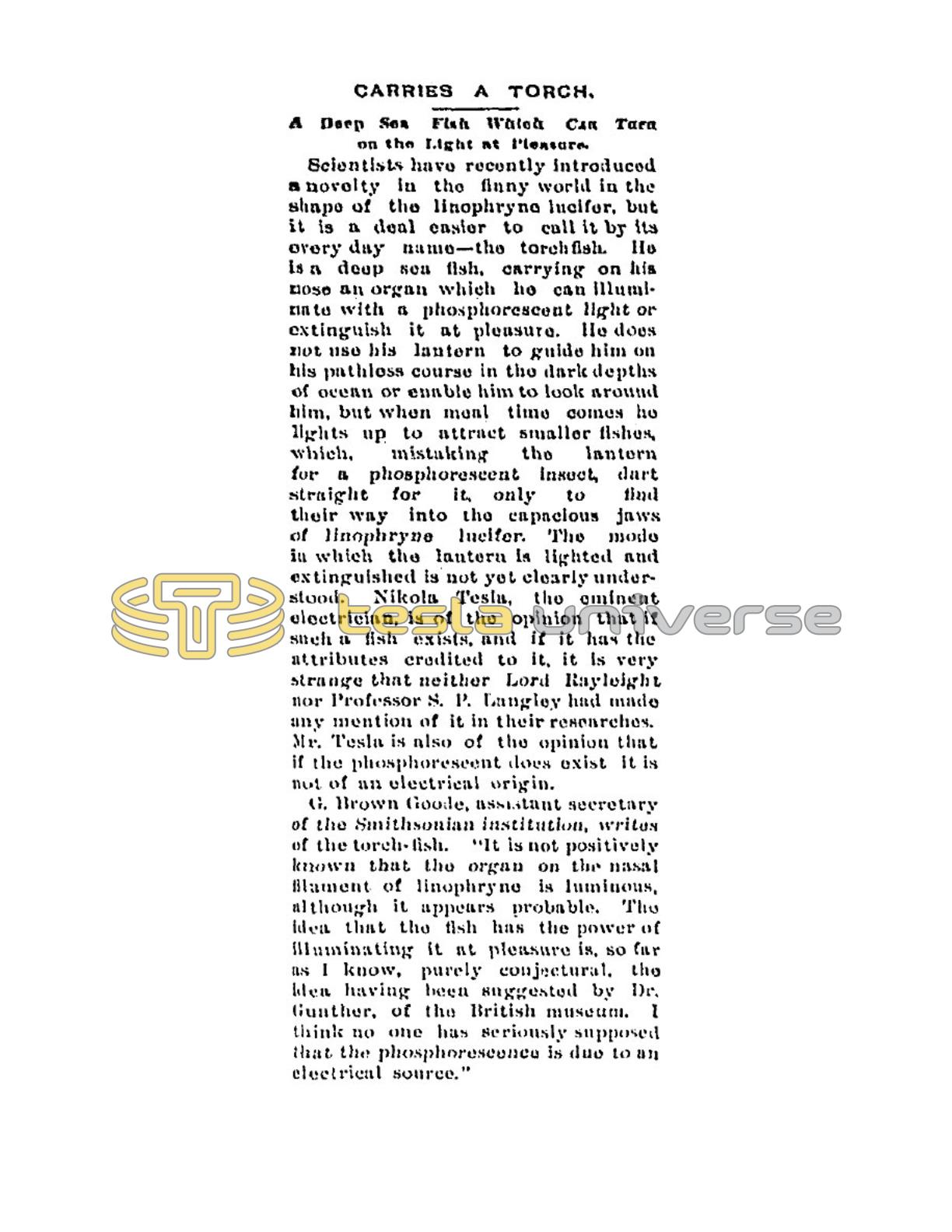 Scientists have recently introduced a novelty in the finny world in the shape of a linophryne but it is a deal easier to call it by its every day name β the torchfish. He is a deep sea fish, carrying on his nose an organ which he can illuminate with a phosphorescent light or extinguish it at pleasure. He does not use his lantern to guide him on his pathless course in the dark depths of ocean or enable him to look around him, but when meal time comes he lights up to attract smaller fishes, which, mistaking the lantern for a phosphorescent insect, dart straight for it, only to find their way into the capacious jaws of linophryne lucifer. The mode in which the lantern is lighted and extinguished is not yet clearly understood. Nikola Tesla, the eminent electrician, is of the opinion that if such a fish exists, and if it has the attributes credited to it, it is very strange that neither Lord Rayleigh nor Professor S. P. Langley had made any mention of it in their researches. Mr. Tesla is also of the opinion that if the phosphorescent does exist it is not of an electrical origin.