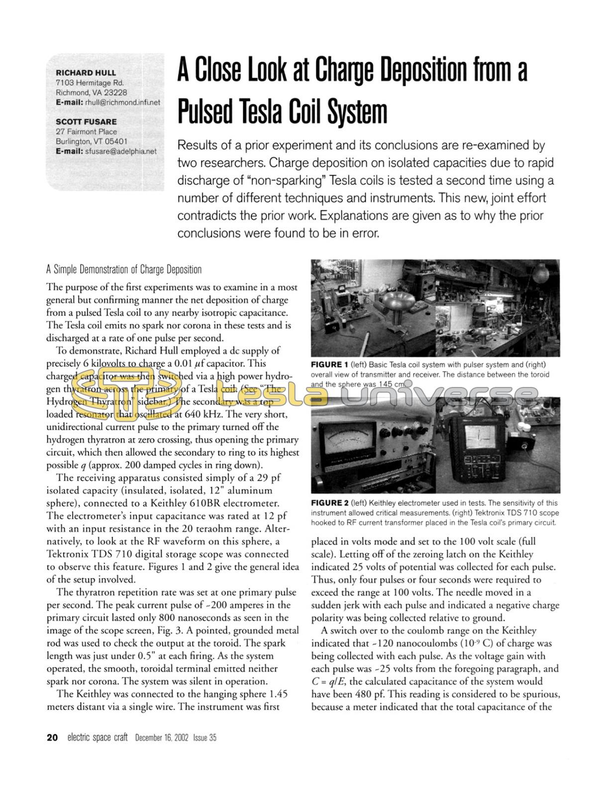 In recent months, I was involved with new experiments using the short pulsed hydrogen thyratron triggered Tesla coil. Again, results were showing the net charging effect reported all along. I started corresponding with my friend and fellow researcher Scott Fusare on a related matter involving Schumann resonances. He had assembled a nice homemade electrometer of high bandwidth and was getting some nice results. Scott had wanted to test out some of the electrostatic experiments reported in ESJ. Armed with a similar electrometer to my own (Keithley 600 series), he began his effort and reported that the Keithley might have a problem reporting correctly on fast, high dVldt pulsed signals over 1 kHz.