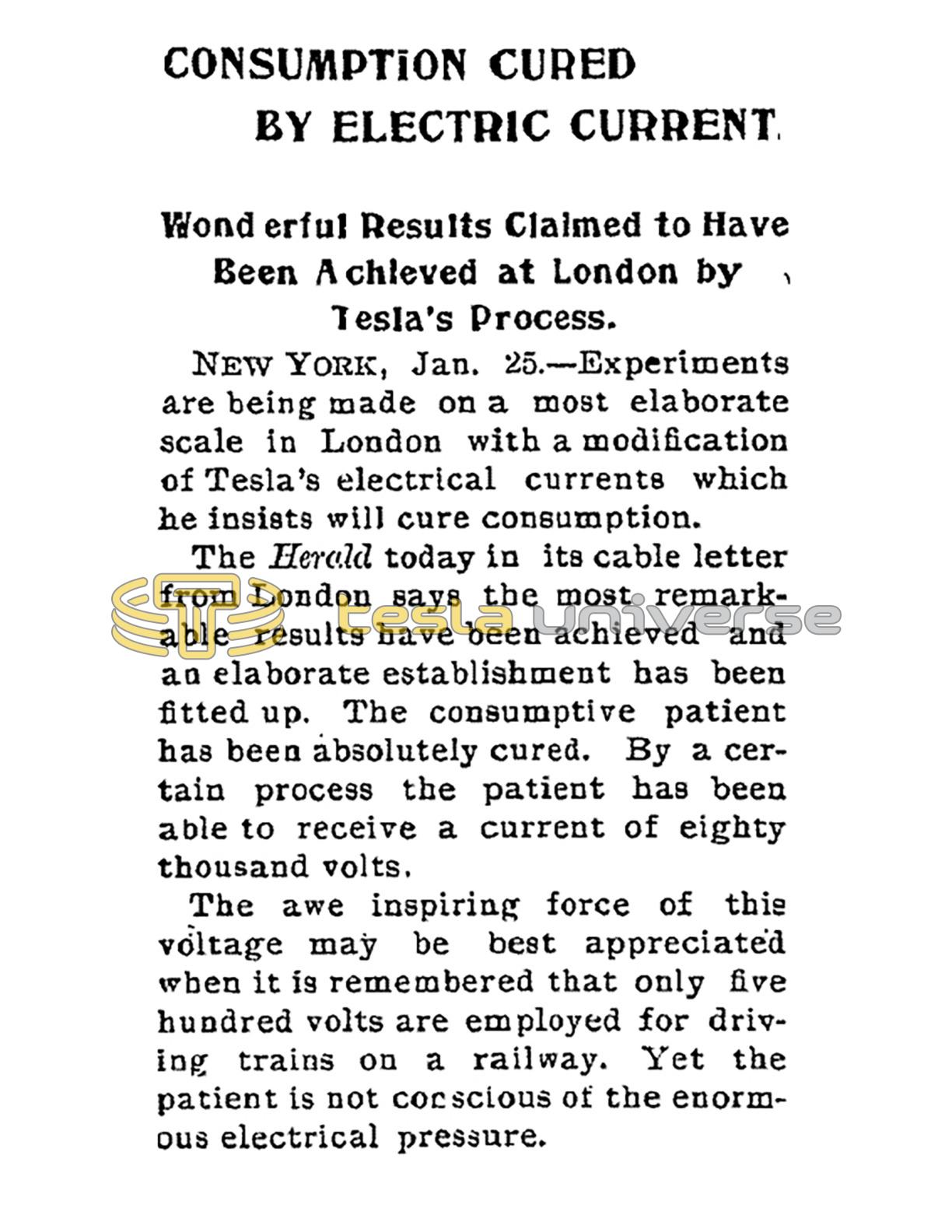 The Herald today in its cable letter from London says the most remarkable results have been achieved and an elaborate establishment has been fitted up. The consumptive patient has been absolutely cured. By a certain process the patient has been able to receive a current of eighty thousand volts.