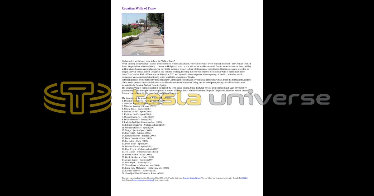The Croatian Walk of Fame is located in the part of the town called Slatina. Since 2005, ten persons are nominated each year, of which five posthumously. The first eight stars were placed in honour of Nikola Tesla, Miroslav Radman, Dragutin Tadijanović, Miroslav Krleža, Dražen Petrović, Janica Kostelić, Krešimir Ćosić and Oliver Dragojević.