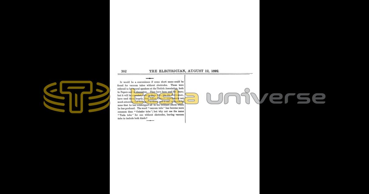 It would be a convenience if some short name could be found for vacuum tubes without electrodes. These were referred to by several speakers at the British Association, both in Papers and in discussion. They have been used for years; but it will be conceded, even by those who, like Dr. Bottomley, have used them largely, that before Tesla's experiments not much attention had been paid to them, and it can be denied by none that he has outstripped all in the brilliant effects which he has produced. The word "vacuum tube" has become more common than "Geissler tube"; but why not use the name "Tesla tube" for one without electrodes, leaving vacuum tube to include both kinds?