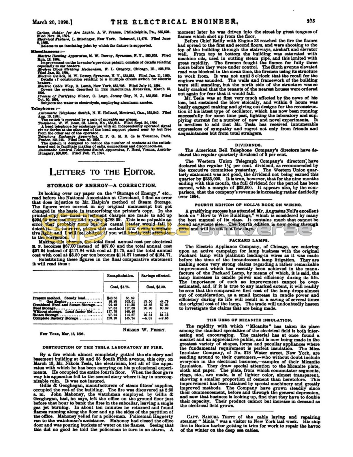By a fire which almost completely gutted the six-story and basement building at 33 and 35 South Fifth avenue, this city, on March 13, Mr. Nikola Tesla, the electrician, lost all of the apparatus with which he has been carrying on his professional experiments. He occupied the entire fourth floor. When the floor gave way his apparatus fell to the second story where it lay in unrecognizable ruin. It was not insured.