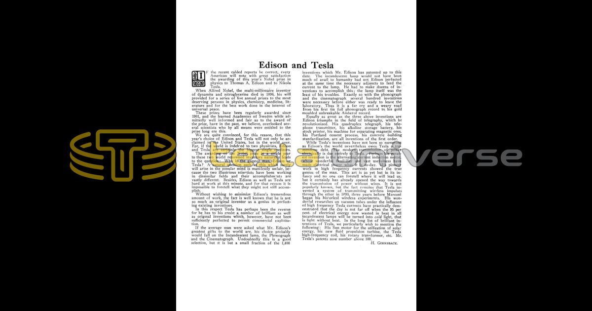 The awarding of the Nobel prize in a single year to these two world renowned inventors naturally leads to the question: Who is the greater man, Edison or Tesla? A natural question such as this which surely will arise in the popular mind is manifestly unfair, because the two illustrious sciertists have been working in dissimilar fields and their accomplishments are vastly different. Besides, Edison as well as Tesla are hard at work at this minute, and for that reason it is impossible to foretell what they might not still accomplish.