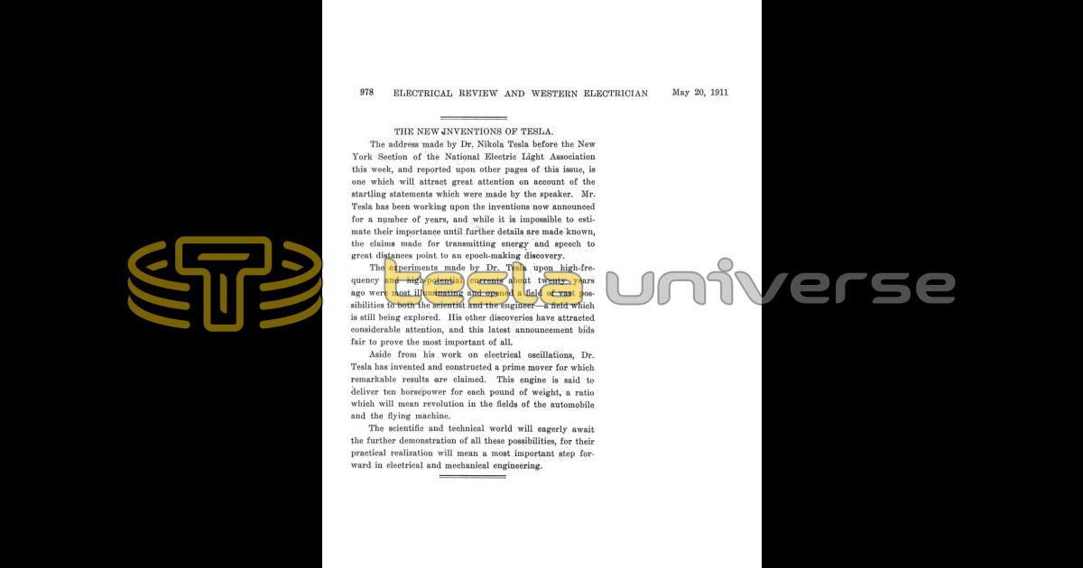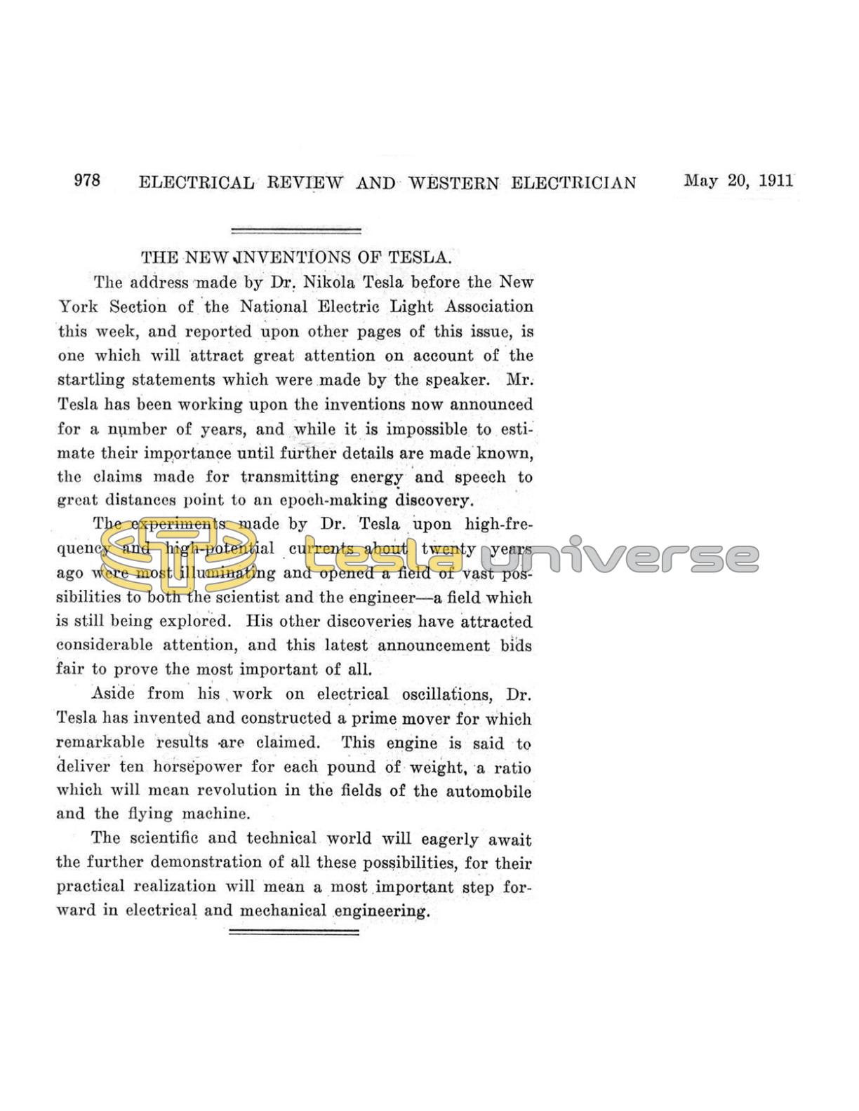 The experiments made by Dr. Tesla upon high-frequency and high-potential currents about twenty years ago were most illuminating and opened a field of vast possibilities to both the scientist and the engineer - a field which is still being explored. His other discoveries have attracted considerable attention, and this latest announcement bids fair to prove the most important of all.