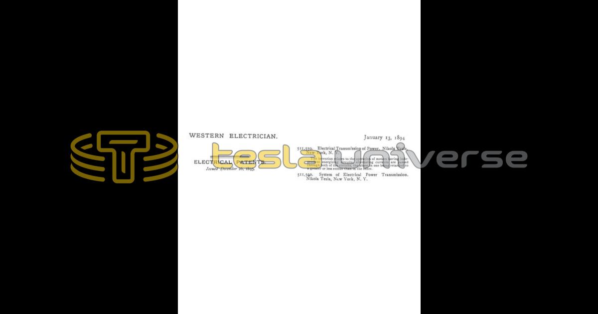 Nikola Tesla Articles Newspaper and magazine articles related to Nikola Tesla Electrical Patents Western Electrician January 13th, 1894 Issued December 26, 1893.511,559. Electrical Transmission of Power. Nikola Tesla,New York, N. Y.The invention relates to the operation of motors having independent energizing circuits; alternating currents are passed through both of the circuits, the phase in one being retarded to a greater or less extent than in the other.511,560. System of Electrical Power Transmission. Nikola Tesla,New York, N. Y. Downloads Downloads for this article are available to members.Log in or join today to access all content. Downloads Downloads for this article are available to members.Log in or join today to access all content. Pagination Enjoy other articles First First item Previous Previous item Next Next item Last Last item Within the Universe Timeline Important moments and events related to Tesla. Articles Nikola Tesla in the press. Books Books written by and about Nikola Tesla. Documents Nikola Tesla documents, files and papers. Quotes Profound and insightful quotes by Nikola Tesla. Movies and TV Nikola Tesla on the screen. Patents Nikola Tesla held around 200 patents worldwide. Landmarks Locations related to Nikola Tesla. Images Nikola Tesla image and photo library. Show more Pagination Enjoy other articles First First item Previous Previous item Next Next item Last Last item Within the Universe Documents Nikola Tesla documents, files and papers. Quotes Profound and insightful quotes by Nikola Tesla. Books Books written by and about Nikola Tesla. Timeline Important moments and events related to Tesla. Patents Nikola Tesla held around 200 patents worldwide. Images Nikola Tesla image and photo library. Landmarks Locations related to Nikola Tesla. Letters Letters to, from and about Nikola Tesla. Movies and TV Nikola Tesla on the screen.